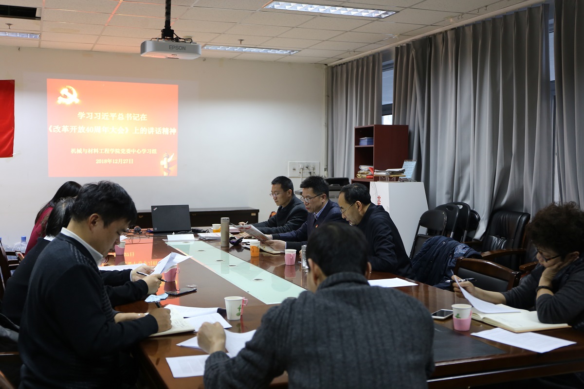2018年12月27日下午,机械与材料工程学院党委理论学习中心组在博闻楼203室召开学习会,集体学习习近平总书记《在庆祝改革开放40周年大会上的讲话》精神。学院班子成员、党委委员、系/中心主任、工会负责同志参加了学习。学习会由院党委书记王文革主持。院中心组学习了习近平总书记在庆祝改革开放40周年大会上的讲话。习近平总书记从实现中华民族伟大复兴的三大里程碑、十八大以来“五位一体”总体布局和“四个全面”战略布局...