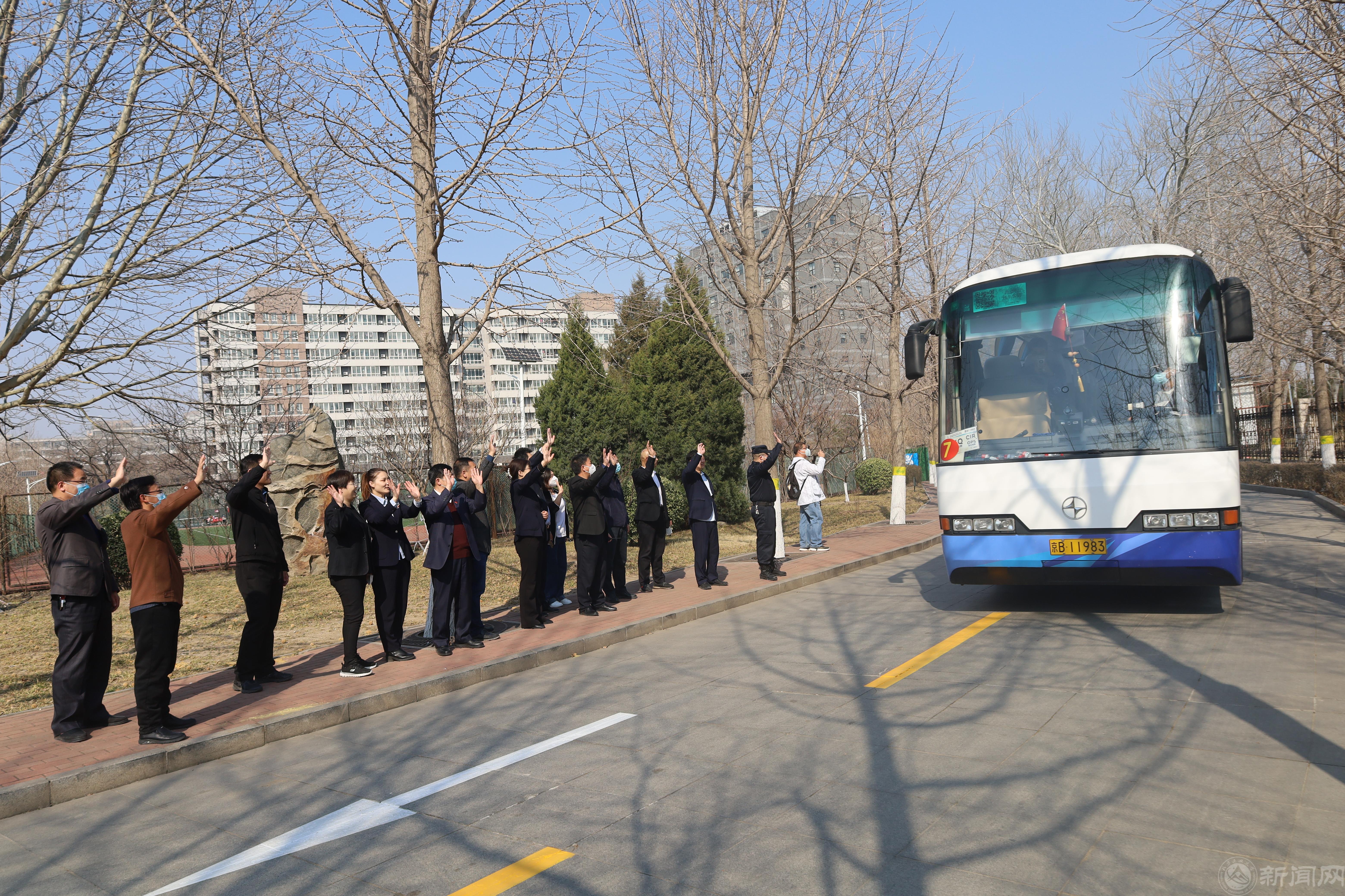 离开驻地的志愿者对学校国教中心恋恋不舍,纷纷与服务保障团队成员依依惜别,在“身披奥运荣光,开启美好未来”的标语前合影留念。服务保障团队送志愿者同学和老师有序登车,一一挥手告别。