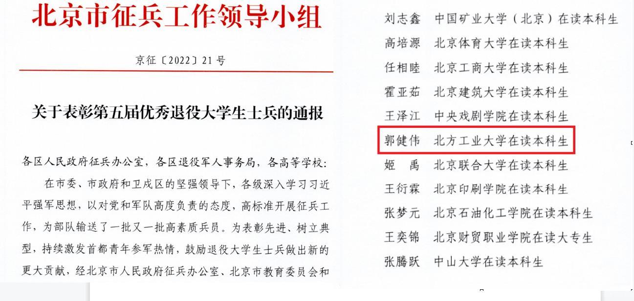 日前,由北京市征兵工作领导小组组织开展的第五届优秀退役大学生士兵评选活动落下帷幕。经过广泛发动、逐级推荐、资格审核、政治考核、现场答辩等环节,全市评选出30名优秀退役大学生士兵,Beat3652019级文法学院郭健伟同学名列其中