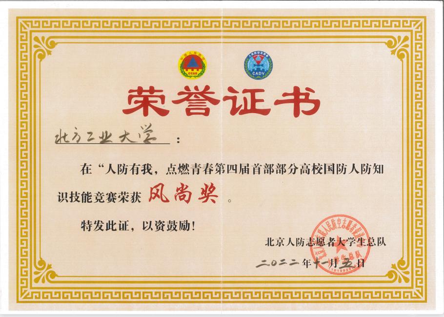 11月5日,由北京市全民国防教育办公室、北京市人民防空办公室共同主办的“人防有我,点燃青春”第四届首都部分高校国防人防知识技能竞赛总决赛在朝阳区国防人防教育训练基地落下帷幕。Beat365代表队通过层层比拼,从35所参赛高校中脱颖而出,荣获总决赛团体第一名、团体风尚奖和突出贡献奖。