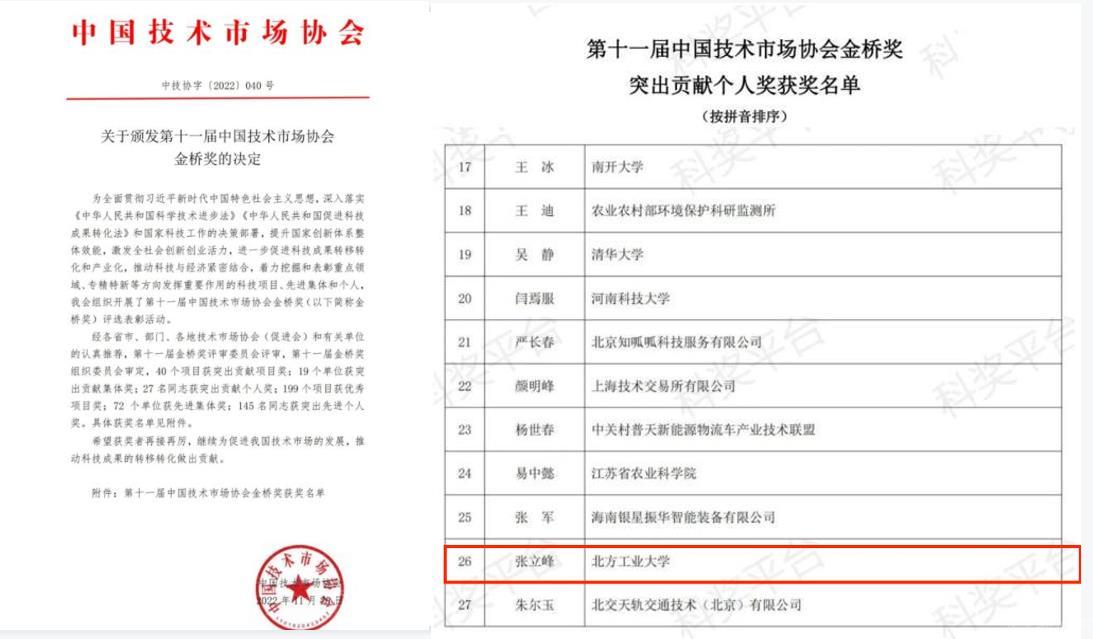 近日,第十一届全国技术市场最高权威奖项金桥奖获奖名单正式公布,张立峰校长荣获金桥奖突出贡献个人奖。