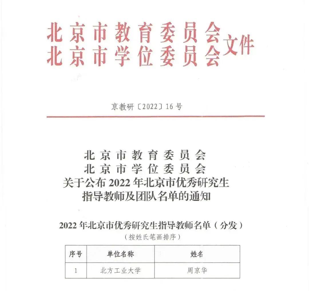 近日,北京市教育委员会、北京市学位委员会公布了2022年北京市优秀研究生指导教师及团队名单,Beat365电气与控制工程学院周京华教授获评“优秀研究生指导教师”。