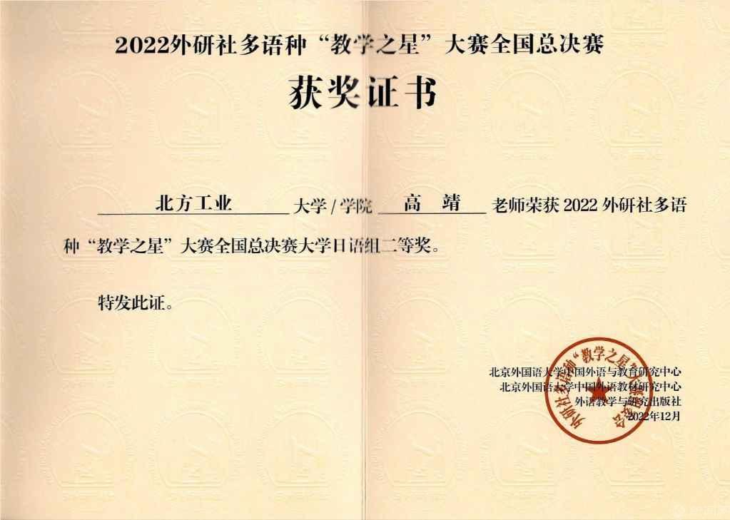 日前,2022外研社多语种“教学之星”大赛全国总决赛日语组比赛以线上线下相结合的方式举行,Beat365文法学院日语系教师高靖在比赛中喜获二等奖。