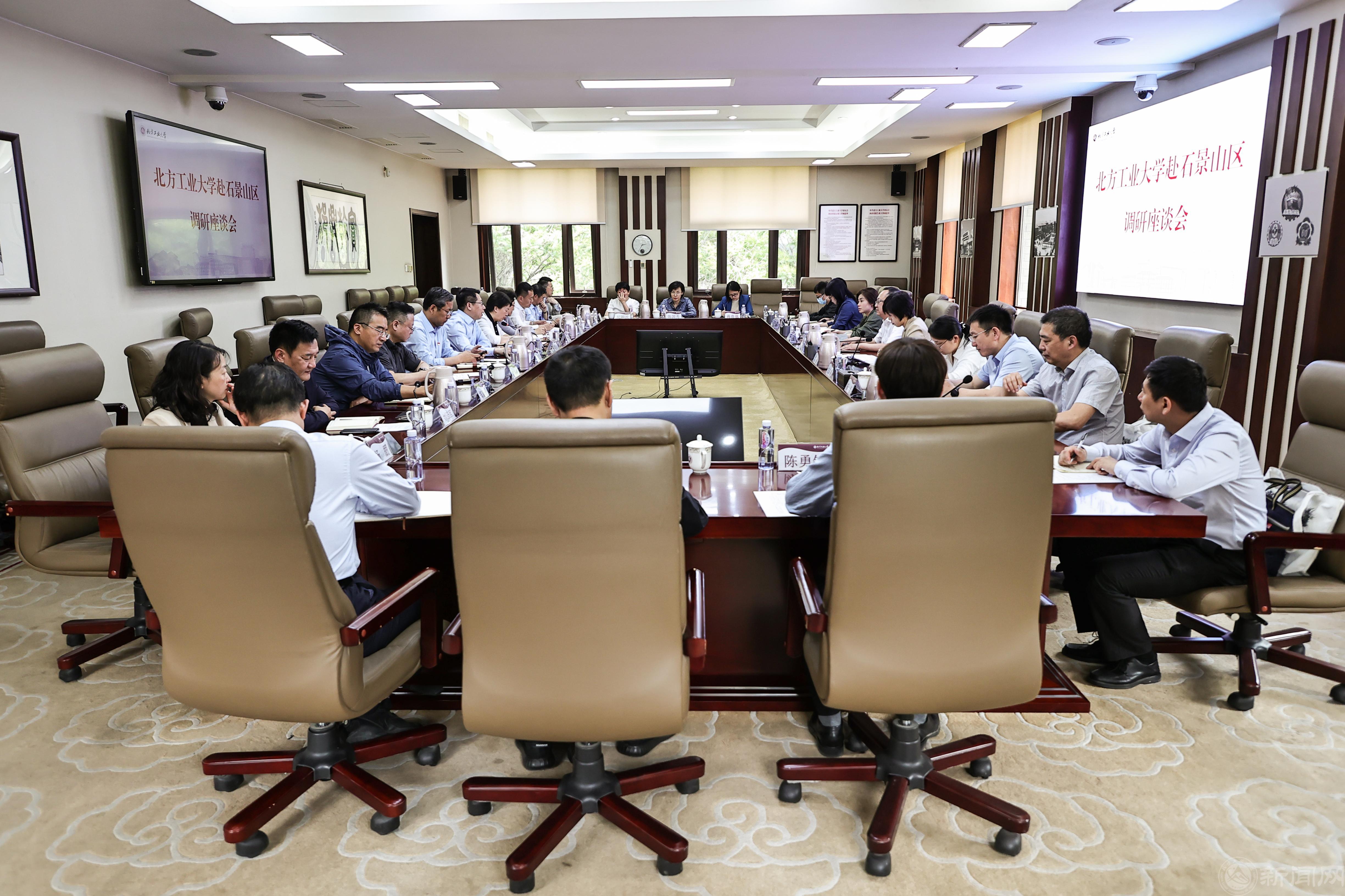 按照学校主题教育工作安排和党委调查研究工作部署,5月11日,校党委书记缪劲翔主持召开深化校区合作、服务区域高质量发展调研座谈会,邀请石景山区委区政府研究室、教工委、科委、司法局、市规自委石景山分局、经信局、文旅局、八角街道党工委、中关村石景山园管委会等部门负责人入校研讨,听取他们对学校服务地区高质量发展的“需求”和促进区校交融共生、共建共享、协同发展的“建议”。学校领导班子成员、相关部门和二级单位负责人参加座谈会。