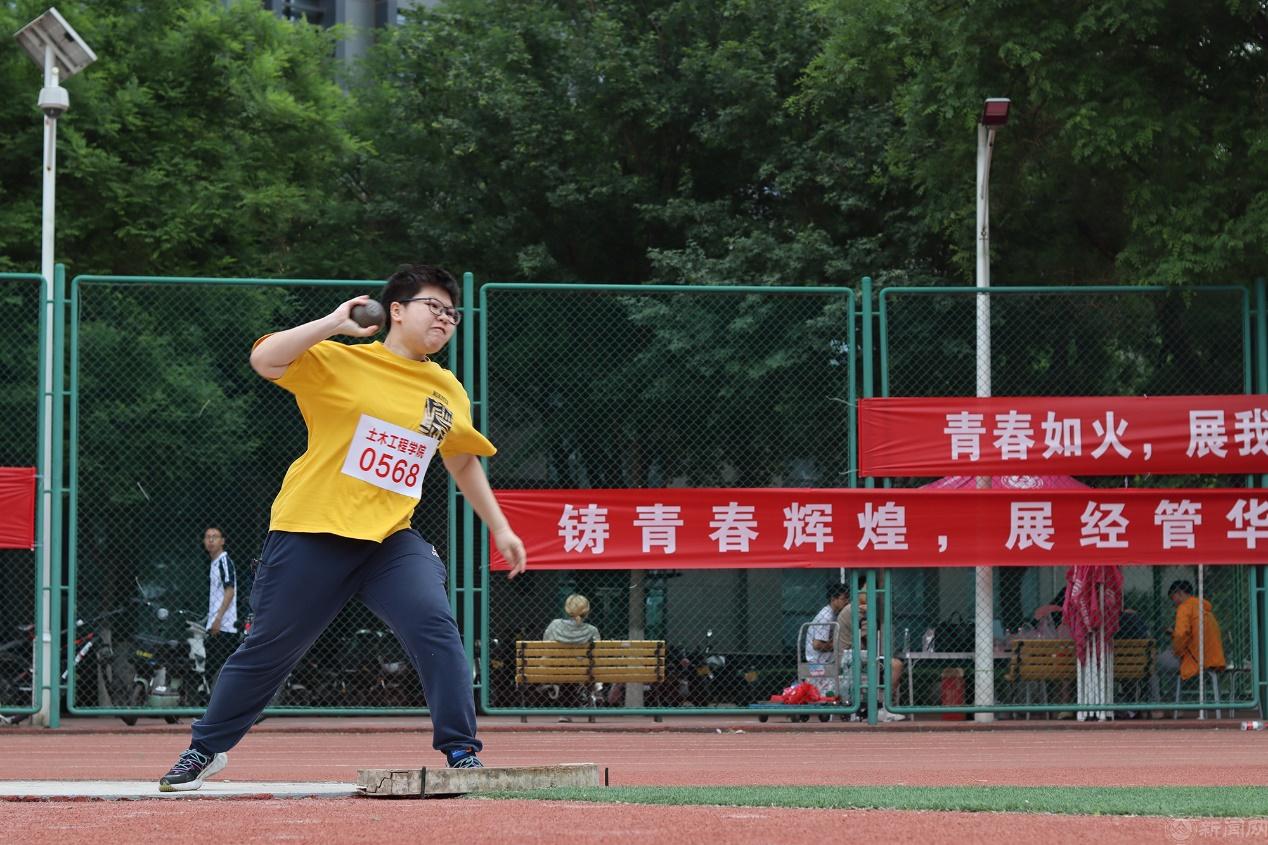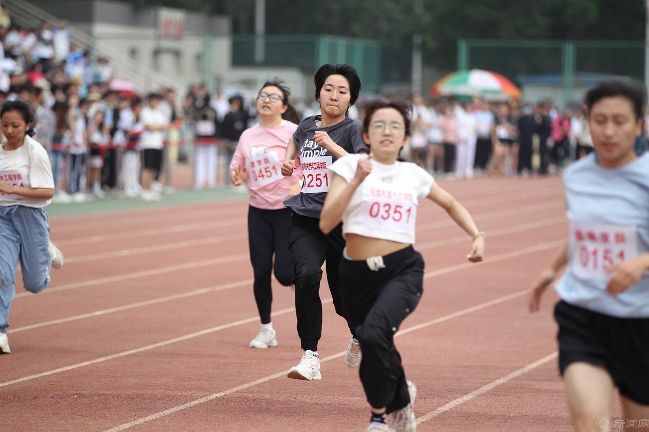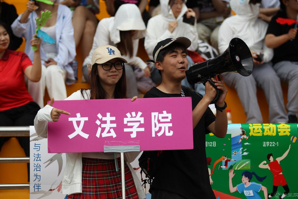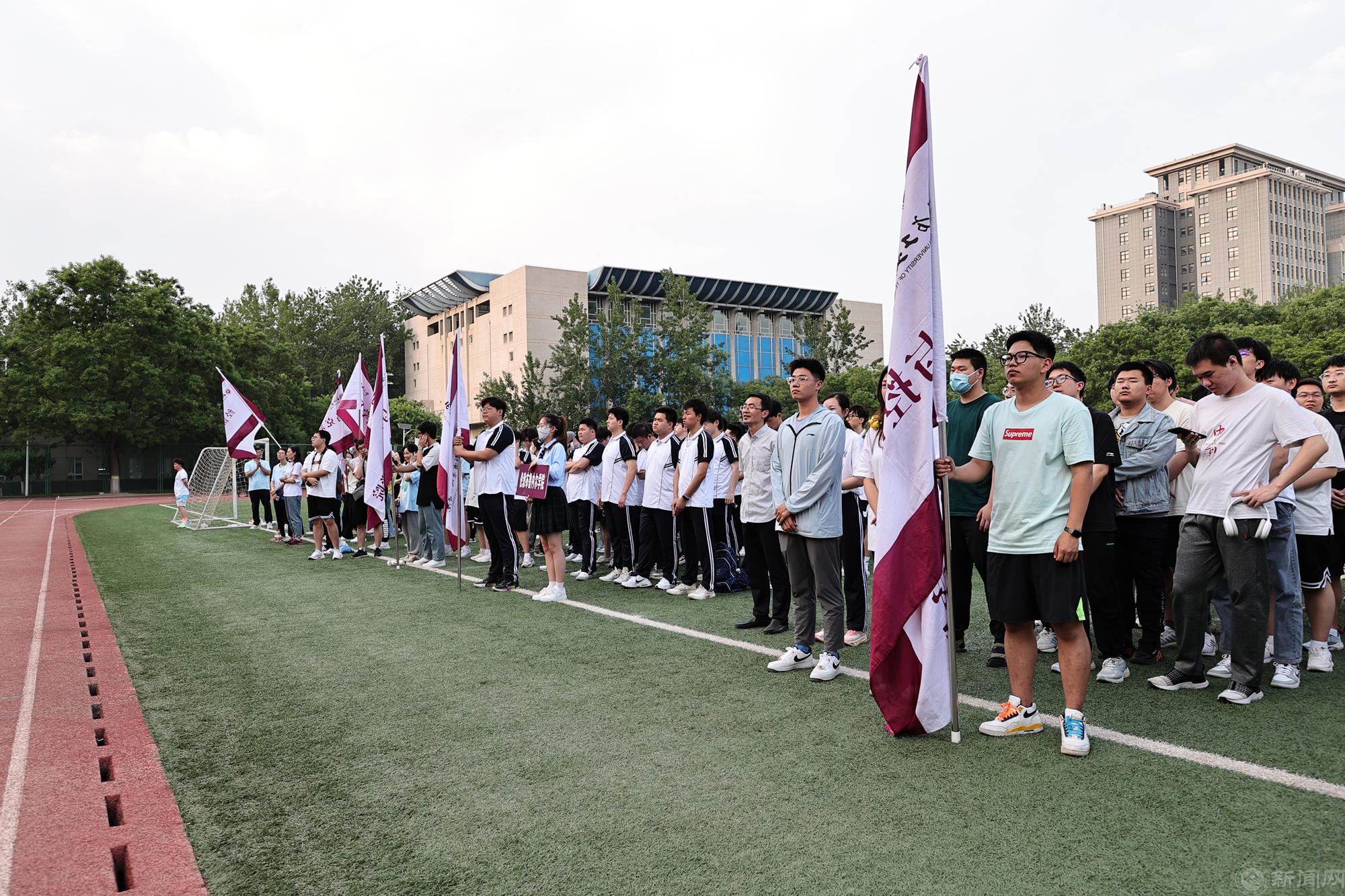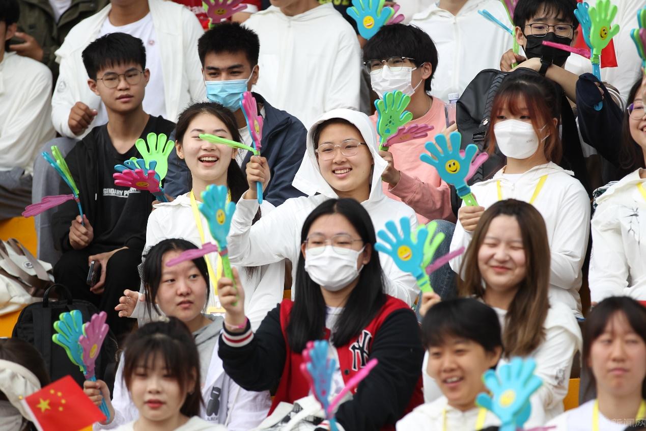 观众看台上五彩斑斓,各学院院旗随风舞动,鼓声、口号声、呐喊声此起彼伏,运动场上洋溢着激情、文明、和谐的氛围。