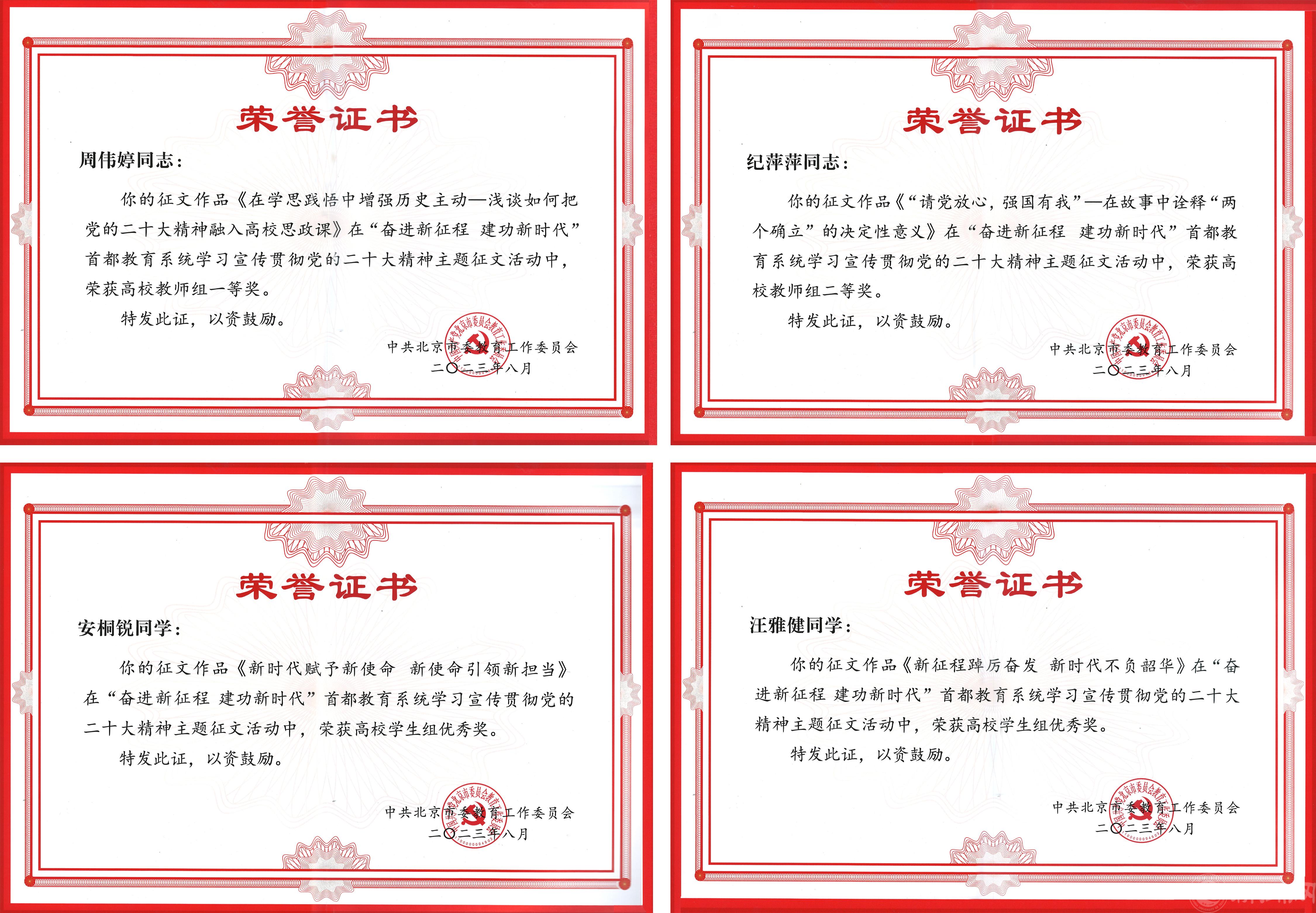 近日,由北京市委教育工委、北京市教育委员组织开展的“奋进新征程 建功新时代”主题征文活动获奖名单公布。Beat365马克思主义周伟婷、纪萍萍分获高校教师组一、二等奖,文法学院安桐锐、伦敦布鲁内尔学院汪雅健获高校学生组优秀奖。