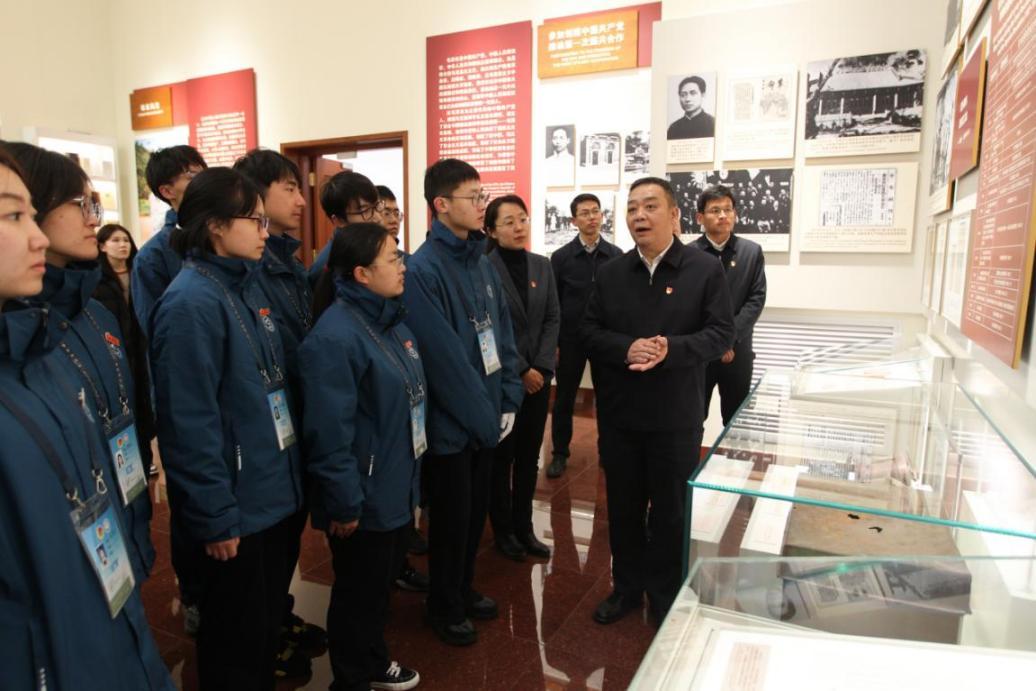 刘军代表学校党委向毛主席坐像敬献花篮,带领志愿者们共同瞻仰毛主席遗容,表达对一代伟人的深切怀念。在毛泽东革命业绩纪念室,刘军带领志愿者共同追忆毛主席光辉的一生,在参观过程中不时驻足讲解,向同学介绍每一幅珍贵的照片、文献背后的历史故事,希望青年学生一定要加强学习、深刻思考,用心感悟伟人的丰功伟绩。