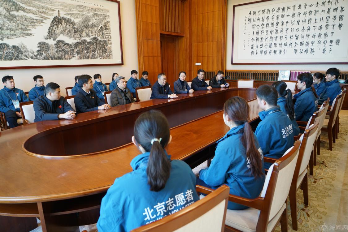 随后,全体人员来到东会议大厅与轮休换岗的志愿者们座谈交流。座谈会上,领队岳熠彤同学汇报了志愿者的工作情况,对各级领导的关怀与慰问表达感谢,她表示全体志愿者将全力以赴守好岗位、做好服务,以最高标准高质量完成本次志愿服务工作。志愿者代表交流分享了工作感受,信息学院何瑞同学表示“为主席站岗,为人民服务”不仅是一项光荣的政治任务,更是一次深刻的爱国主义教育,要发扬工大青年志愿者的优秀品质,让来自五湖四海的瞻仰群众感受到来自首都北京的热情与温度;理学院赵雪娇同学分享了自己在外围引导岗为瞻仰群众提供信息咨询、秩序维护服务中遇到的感人故事;退役大学生士兵、电气与控制工程学院刘迪同学表示,自己将永远把为人民服务的宗旨记在心中,退伍不褪色,全力以赴做好志愿服务工作,以实际行动展现新时代工大青年和退役军人的风采。
