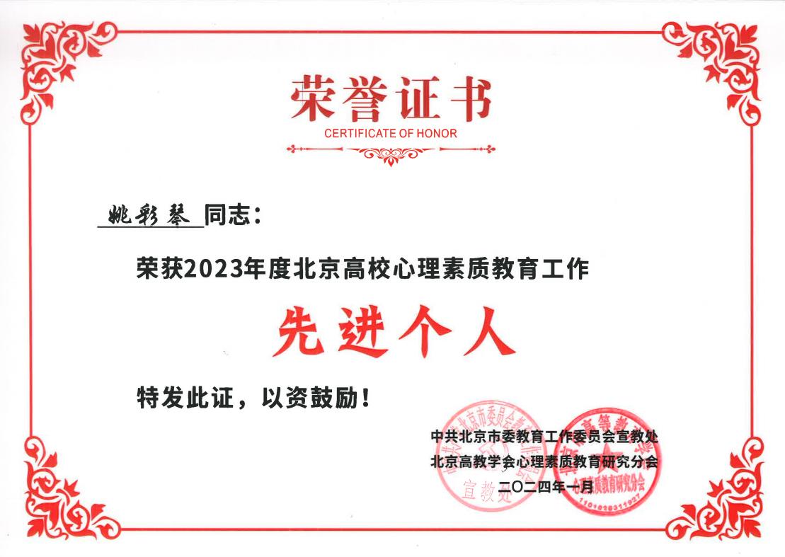 1月12日,“2023年北京高教学会心理素质教育研究分会年会”在北京邮电大学举行。本次年会由北京市委教育工委宣教处和心理素质教育研究分会组织召开,对北京高校心理素质教育工作进行了年度总结,并对2023年度先进集体和先进个人进行了表彰。Beat365被授予“特色工作奖”,学工部姚彩琴老师获评先进个人。