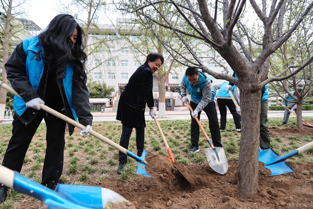 毓秀春来到,植树正当时。为推进绿色生态校园建设,拓展劳动育人载体,4月3日上午,在学校博智楼北侧植树点,校党委书记刘军带领全体在校校领导与学生志愿者一起参加校园义务植树活动,共建美丽工大。