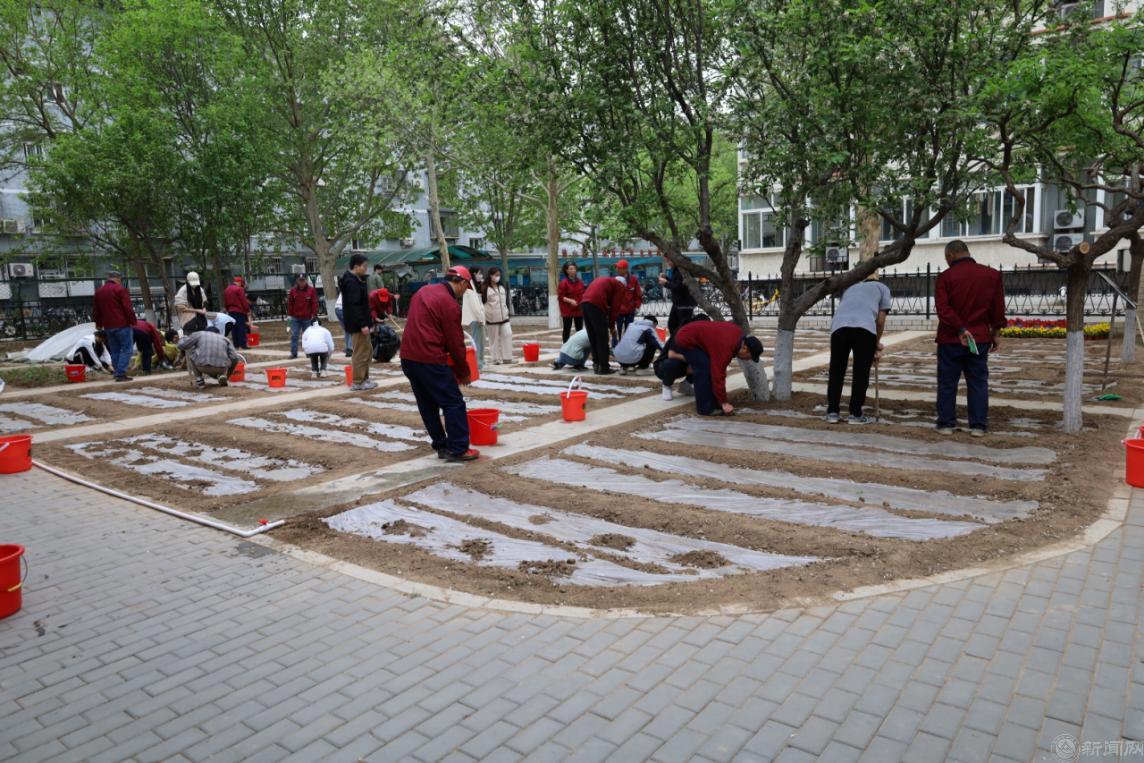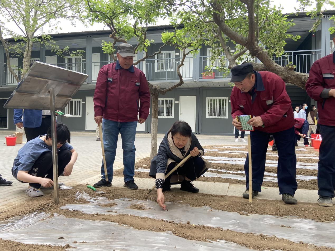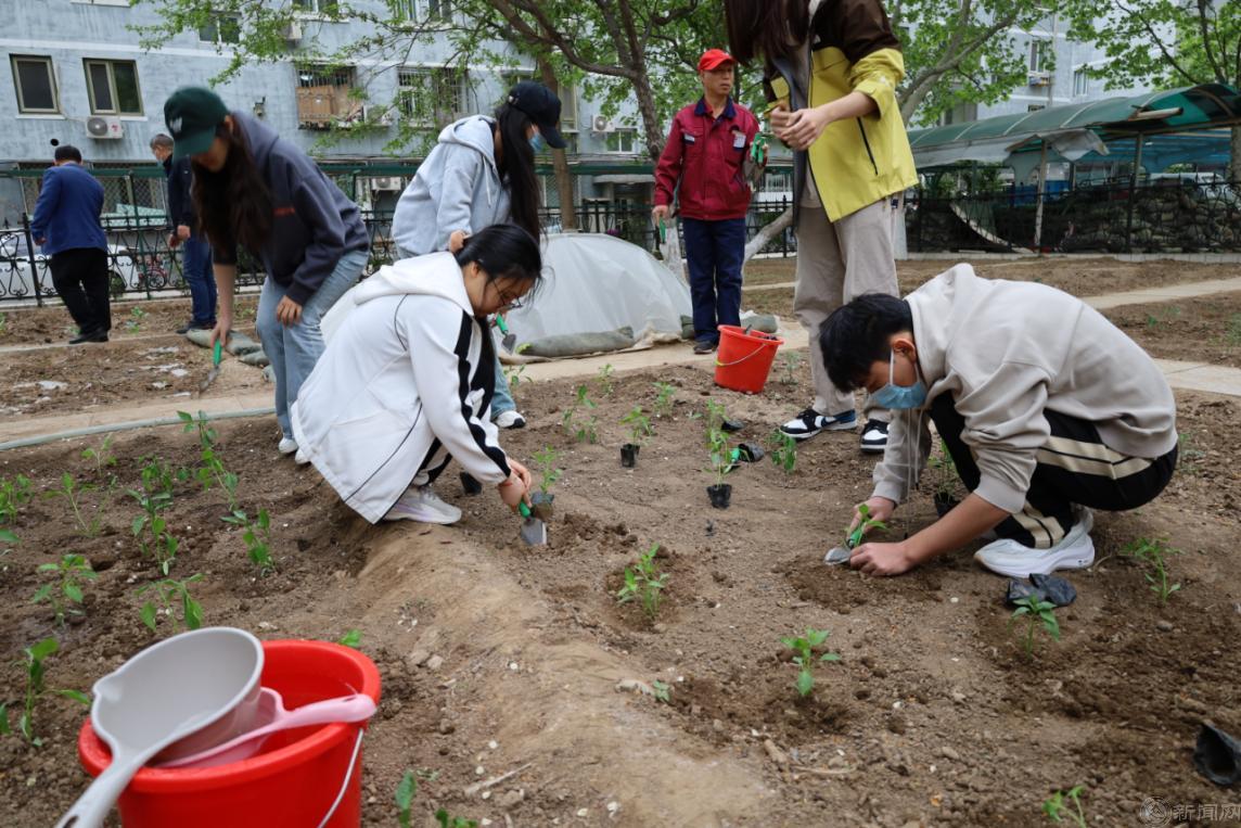 绿化师傅现场演示了种子和秧苗的种植方法,传授了种植技巧。老师和同学们三五一组,每组由一名绿化师傅带领,相互配合、共同劳作。种子种植利用提前准备的种植标尺,从点坑、播种、覆土、浇水四步骤完成种植;秧苗移栽则用小铲子刨坑、放苗、覆土、压实、浇水五步骤完成栽种。师生员工协力,共完成豆角播种8垄、黄瓜播种16垄,移栽西红柿、辣椒、茄子秧苗200余株。