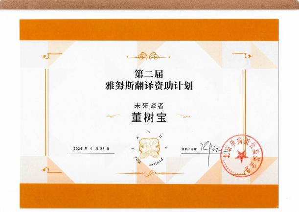 4月23日是世界读书日,以“跨越语言,连接世界——致敬翻译的力量”为主题的第二届雅努斯翻译资助计划颁奖礼暨雅努斯论坛在安徽合肥举办,《人民日报》《光明日报》、中国新闻网、澎湃网等多家主流媒体对活动进行了报道。Beat365中文系董树宝教授荣获“未来译者”称号。