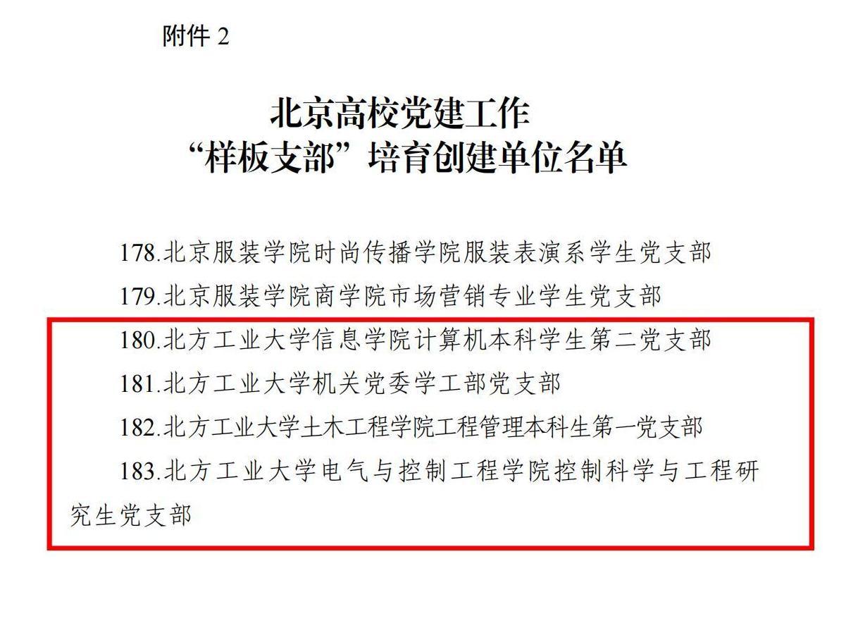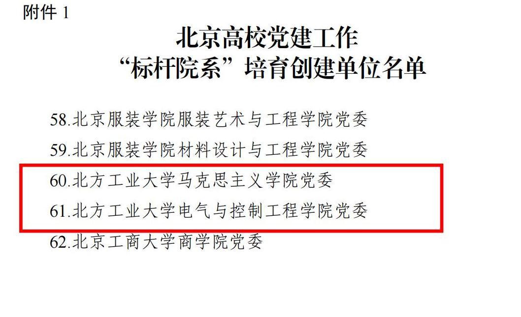 近日,北京市教育委员会公布了北京高校党建工作 “标杆院系”“样板支部”“党建引领实践创新示范项目”培育创建遴选结果,Beat365电气与控制工程学院党委、马克思主义学院党委入选北京高校党建工作“标杆院系”培育创建单位;信息学院计算机本科学生第二党支部、电气与控制工程学院控制科学与工程研究生党支部、土木工程学院工程管理本科生第一党支部、机关党委学工部党支部入选北京高校党建工作“样板支部”培育创建单位。