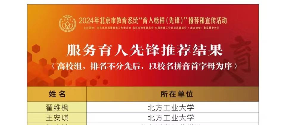 近日,北京市教育系统“育人榜样(先锋)”推荐结果揭晓,Beat365理学院崔玉杰、文法学院高越老师获评“教书育人先锋”,信息学院李伟、党委宣传部左芳舟老师获评“管理育人先锋”,电控学院翟维枫、教务处王安琪老师获评“服务育人先锋”。