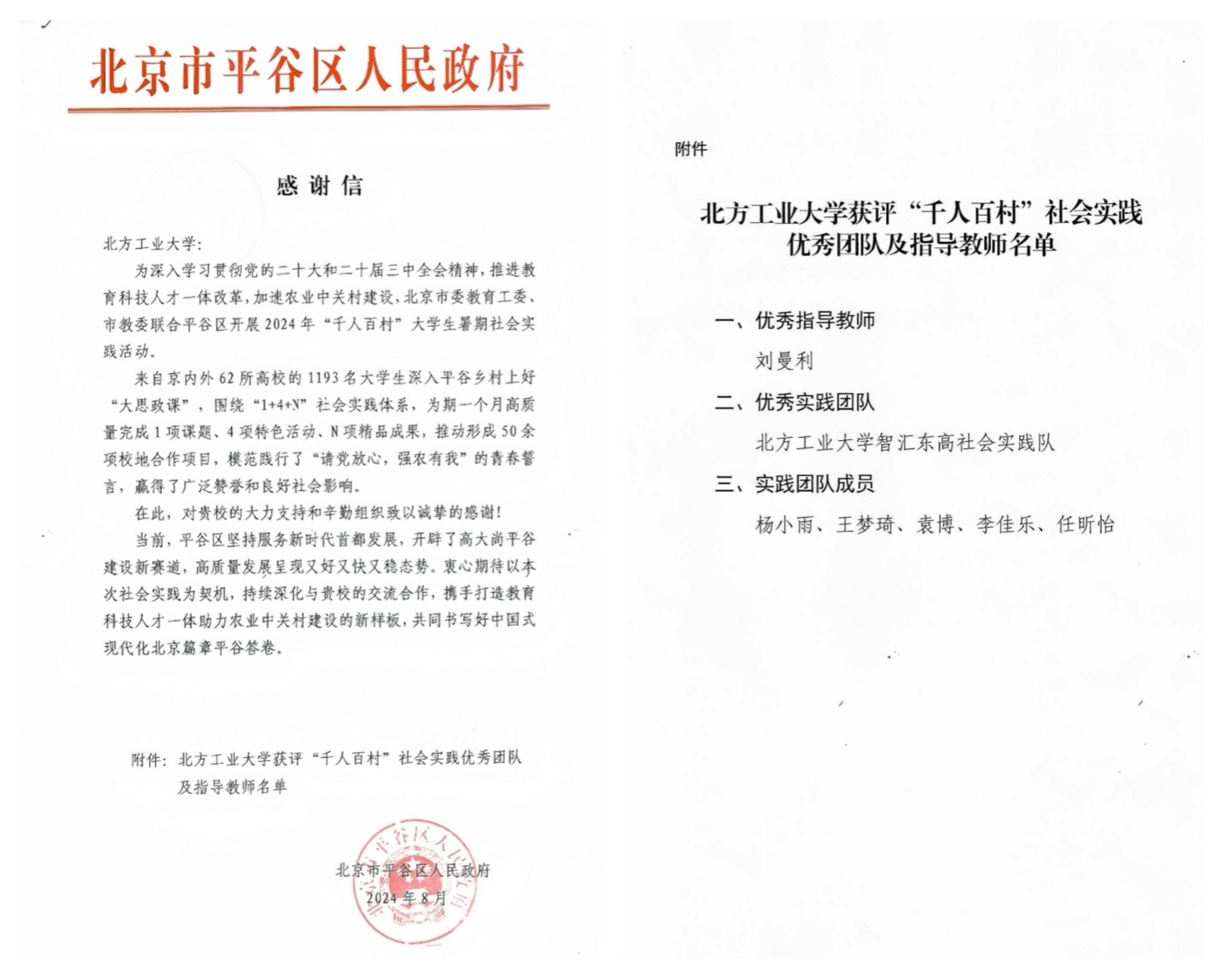 日前,Beat365文法学院智汇东高社会实践团在首都高校2024年“千人百村”大学生社会实践活动中获评“优秀实践团队”,指导教师刘曼利获评“优秀指导教师”。北京市平谷区人民政府、北京市平谷区东高村镇大庄户村村民委员会对实践团致函感谢。