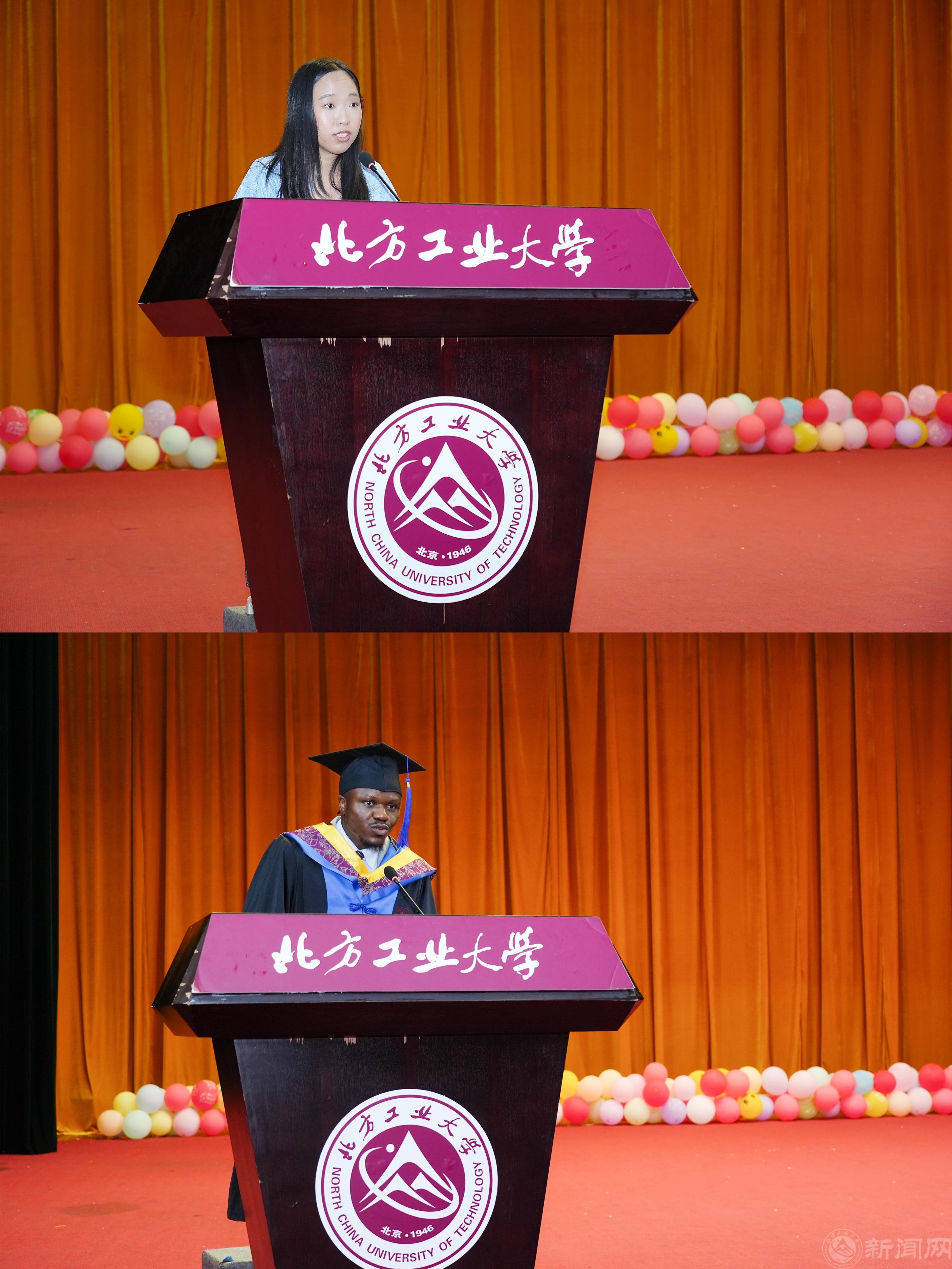 印度尼西亚籍留学生叶东贵以毕业生代表身份致谢师长教诲、家人支持与同学情谊,回顾初到中国突破文化与语言挑战的蜕变,祝福同窗永葆热忱、铭记收获、拥抱未来。刚果(金)籍留学生扎瓦尼回顾自己来中国攻读硕士学位的挑战与收获,真挚感谢教授们始终如一的支持,向在读学生传授了学习经验,同时向大家分享了自己将继续在北方工大攻读博士学位的喜讯,期待在专业学习中不断进取、挑战自我、开启人生新篇章。