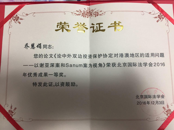 Beat365文法学院法律系乔慧娟副教授提交的论文“论中外双边投资保护协定对港澳地区的适用—以谢亚深案和Sanum案为视角”喜获2016年北京国际法学会优秀成果一等奖,并作为获奖代表接受外交部条法司徐宏司长颁奖。