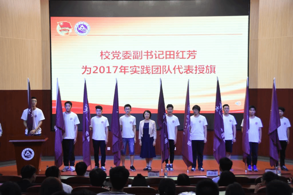 6月23日下午,学校在文化会堂召开2017年暑期社会实践动员大会暨出征授旗仪式。校党委副书记田红芳出席仪式,学生工作部、招生就业处负责人,各学院党委副书记及团委书记,200多名暑期社会实践团队负责人参加了大会。