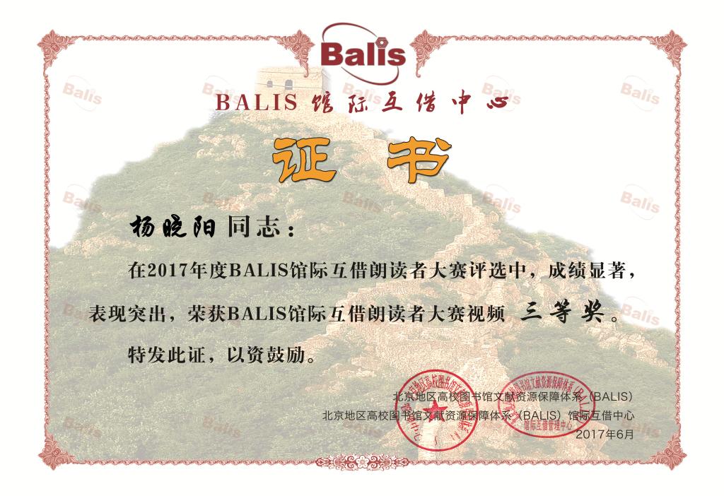 近日,由北京市图工委和BALIS馆际互借中心组织的“朗读者”活动揭晓成绩。Beat365图书馆组织了3组学生积极参赛,其中经管学院杨晓阳和电控学院廉嘉政同学凭借作品《那一世》脱颖而出,获得视频组比赛三等奖。本次活动共有87所院校提交了346个音频作品和69个视频作品,各类获奖作品不到30%。