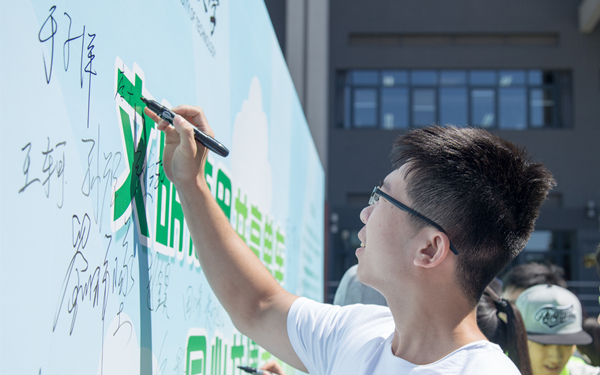 最后,参加活动的师生们在背景板上签名,以示承诺文明使用共享单车、共建美丽校园的决心。
