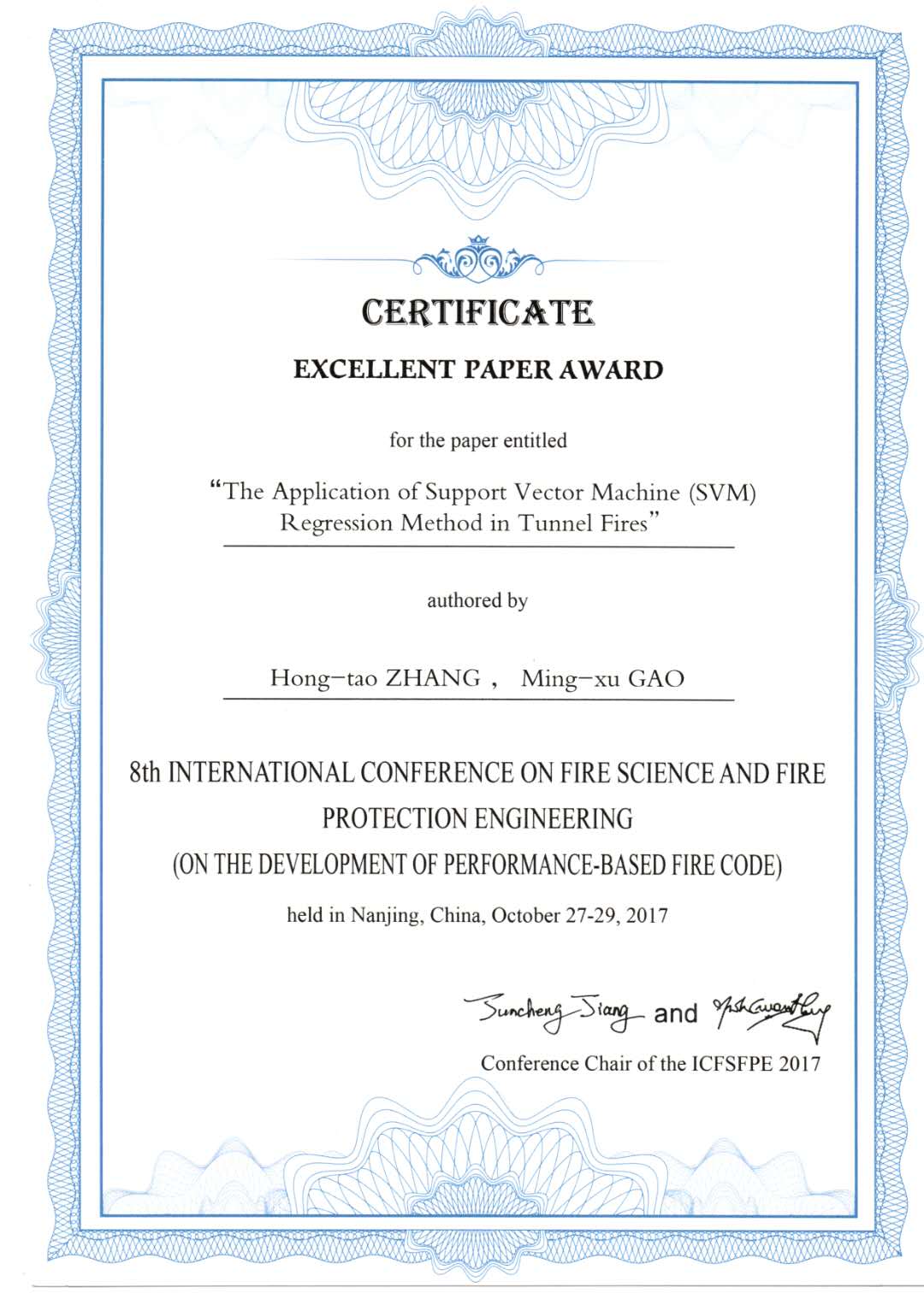 土木工程学院张宏涛老师和研究生高明旭完成的论文《The application of support vector machine (SVM)regression method in tunnel fires》,将机器学习算法与火灾安全研究相结合,为火灾性能化设计研究尤其是地下空间火灾安全研究提出了新方法,荣获优秀论文奖。