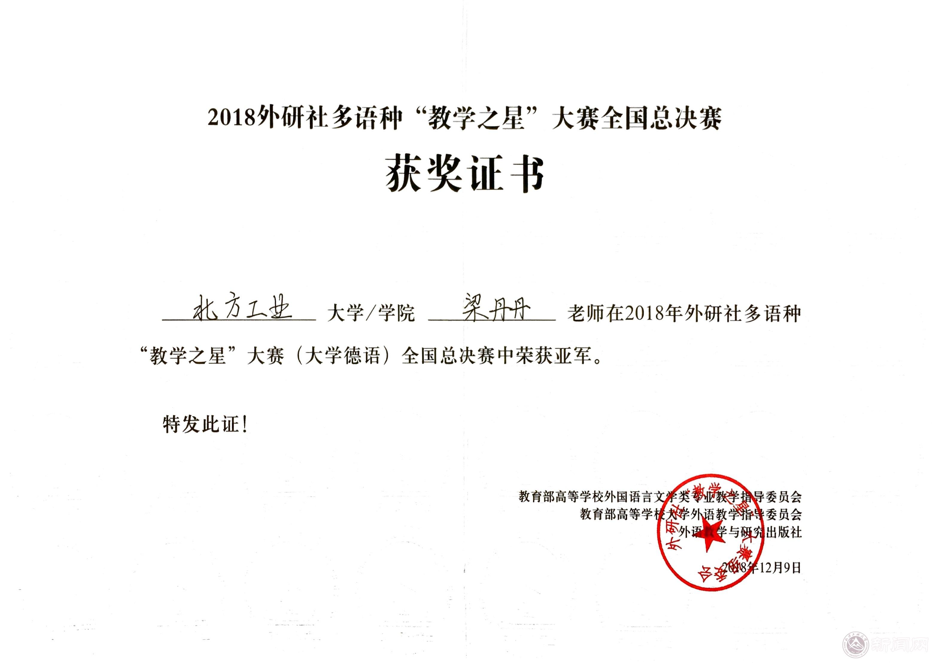 12月9日,由教育部高等学校外国语言文学类专业教学指导委员会、教育部高等学校大学外语教学指导委员会和外语教学与研究出版社共同举办的外研社杯多语种“教学之星”大赛全国总决赛落下帷幕,Beat365文法学院英语系梁丹丹老师获得大学德语组亚军。