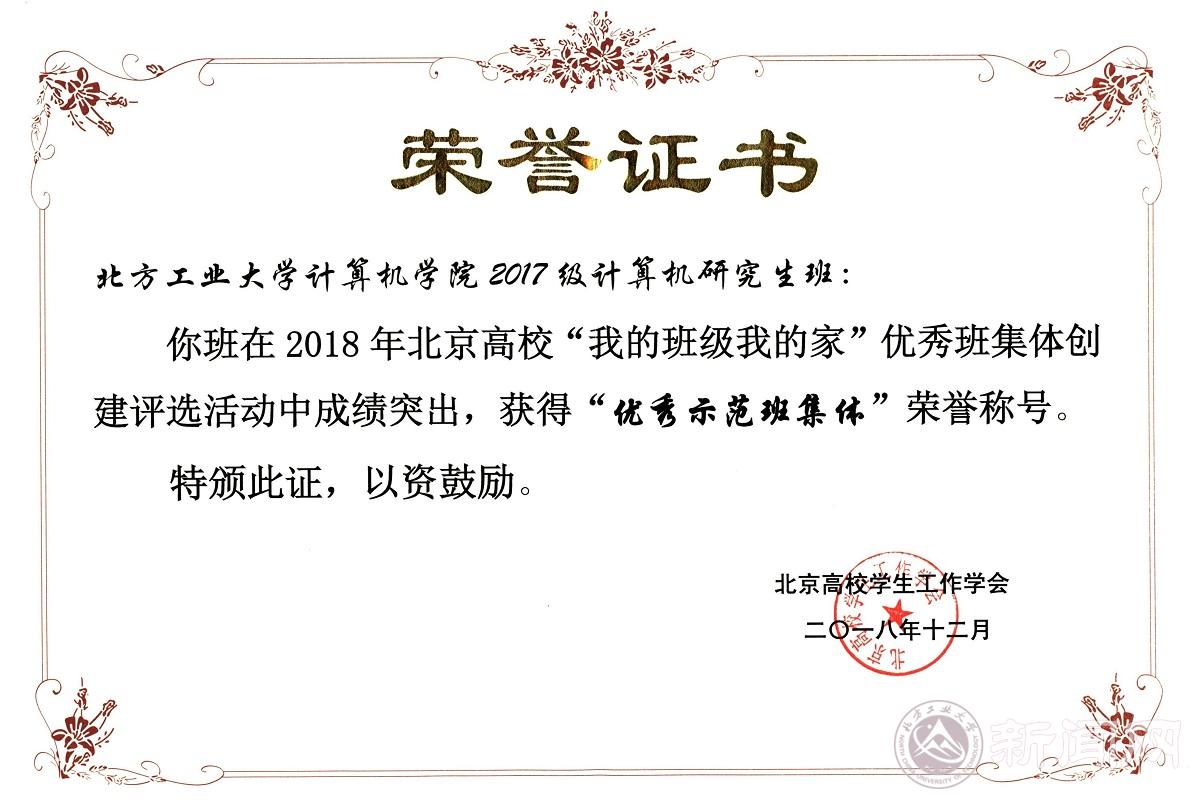 12月19日,2018年北京高校“我的班级我的家”优秀班集体创建评选会在北京工业大学举行。Beat365计算机学院17级计算机研究生班获得了北京高校“优秀示范班集体”称号。