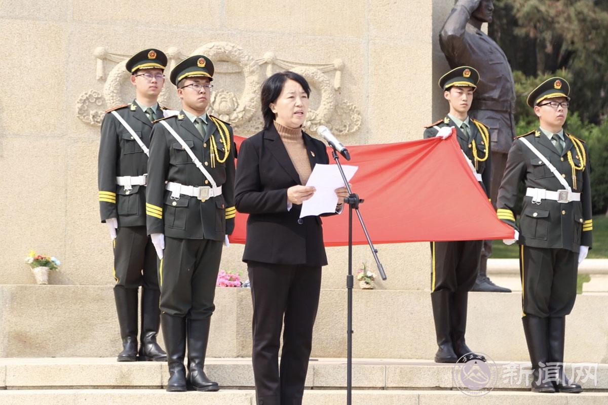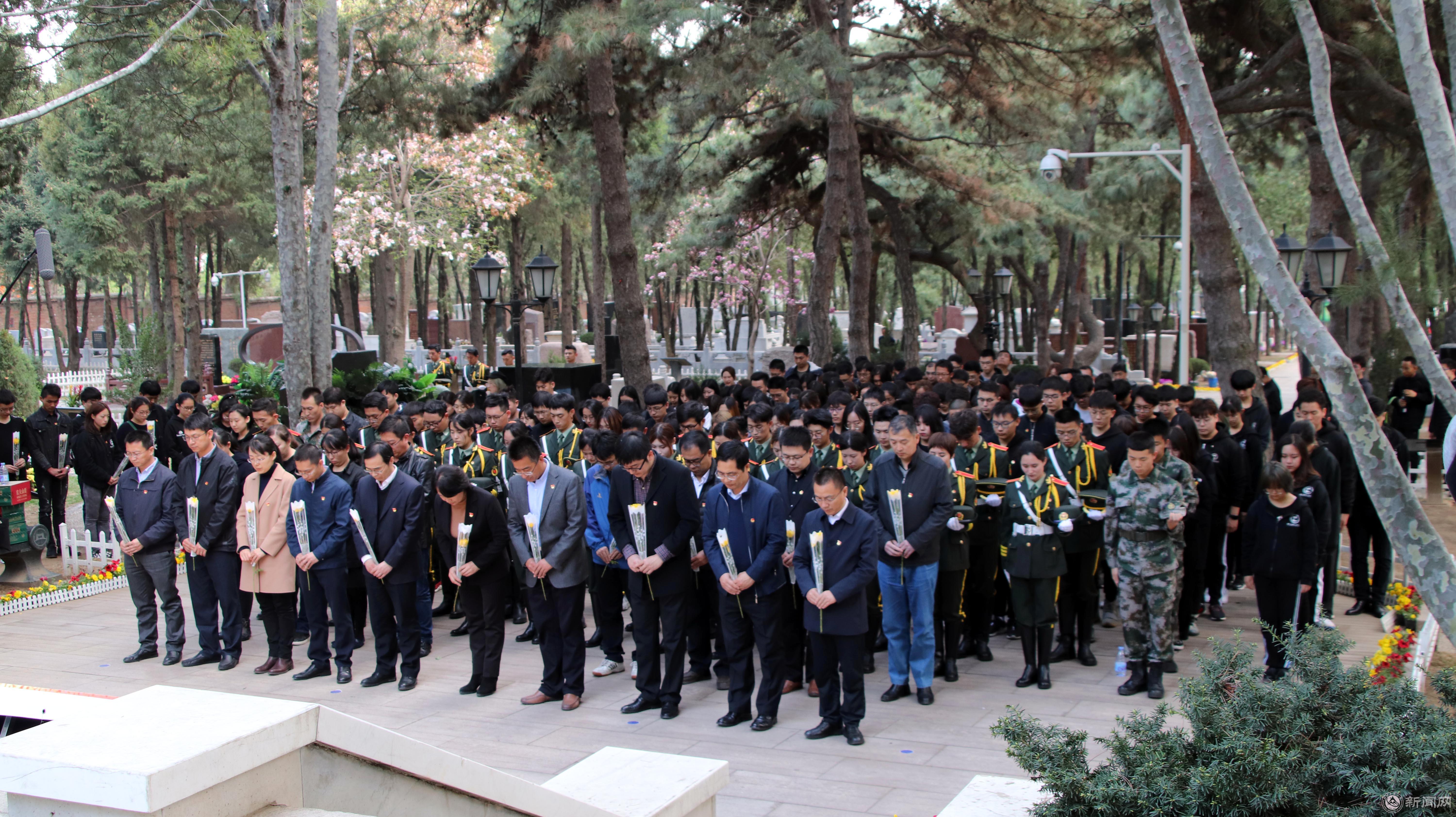 活动在高唱的国歌声中开始。伴着庄严肃穆的献花曲,学生代表向革命先辈敬献花篮,校党委副书记田红芳上前整理花篮缎带。