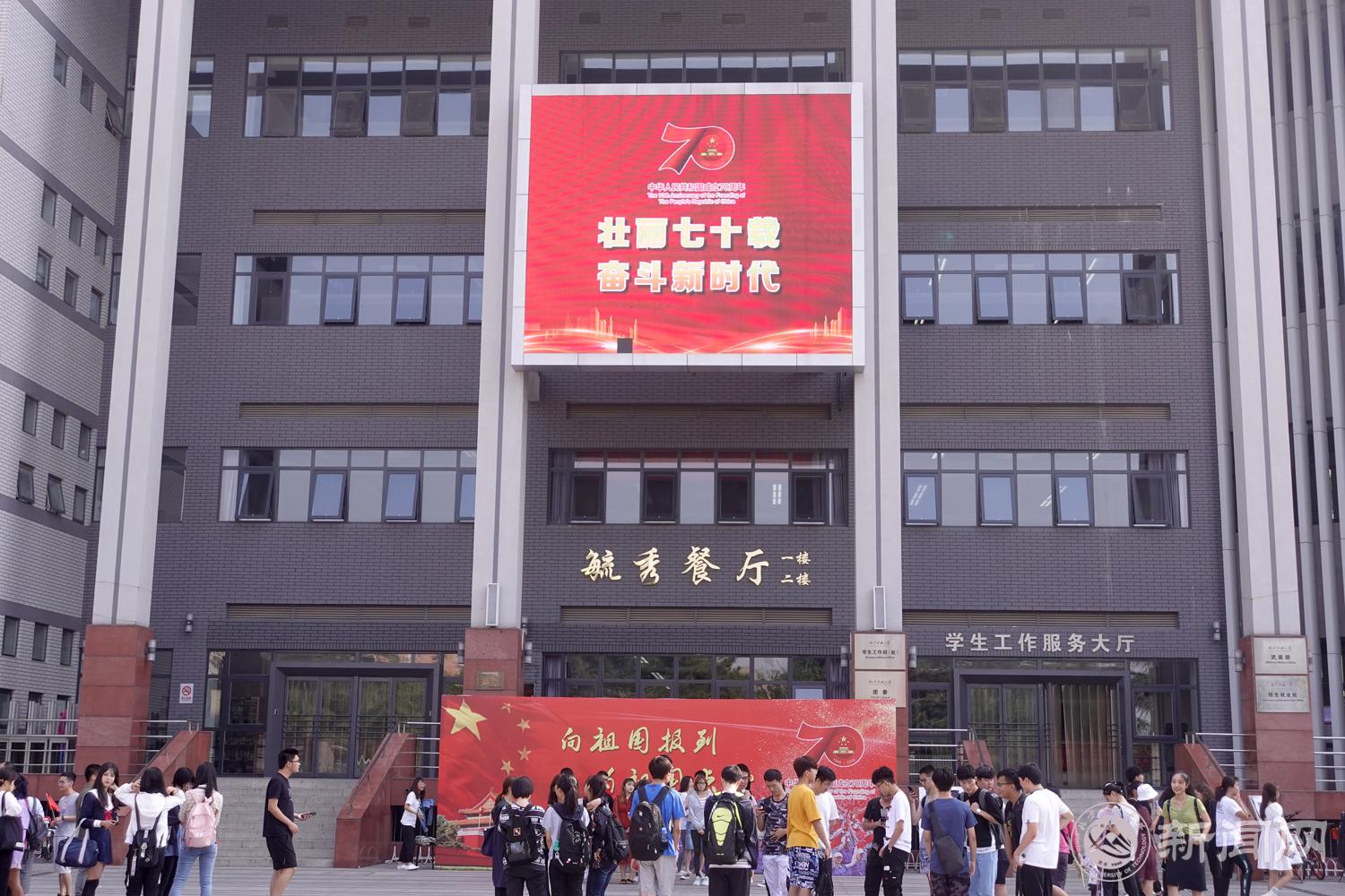 毓秀广场,大屏幕上鲜明的国庆主题十分醒目。