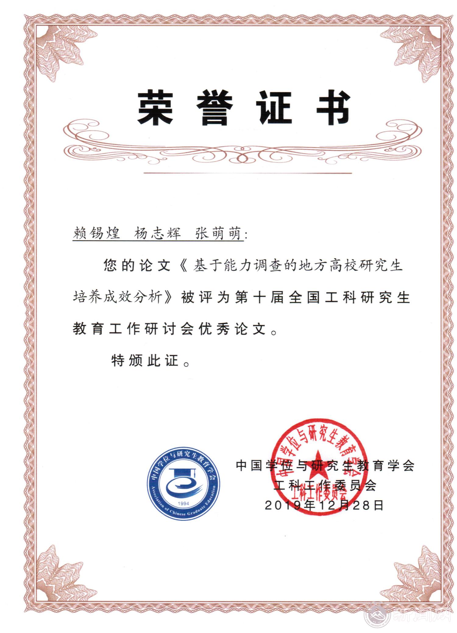 近日,2019年第十届全国工科研究生教育工作研讨会在昆明理工大学举办,来自全国192所高校的1000余名代表参加了会议。Beat365研究生院教师赖锡煌、杨志辉、张萌萌撰写的 “基于能力调查的地方高校研究生培养成效分析”获得“优秀论文”奖。本次会议共录用来自国防科技大学、复旦大学、同济大学、山东大学、哈尔滨工业大学等全国高校投稿的论文86篇,经过专家委员会严格评审,从中遴选出9篇优秀论文,Beat365是唯一获奖并应邀在会议上介绍成果的地方院校。