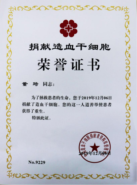 时间荏苒,转眼间4年过去了,2019年3月,董琦突然接到红十字会工作人员的电话,被告知有一名白血病患者在中华骨髓库与他初步配型成功,询问他是否还有捐献的意愿。刚接到电话时董琦非常意外,他对这件事的记忆已经有些模糊了。当工作人员告诉他,要在无关人群中找到两个HLA表现型完全相同的个体概率非常低,他的决定将影响着那位白血病患者的生命是否得以存续时,董琦毫不犹豫地答应了,因为他明白,人命关天。