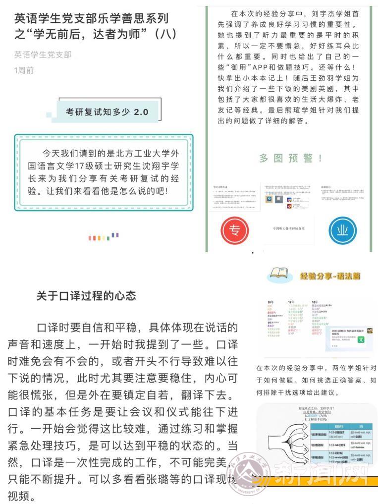 在得知由于疫情延期开学后,支部党员意识到大二学生难以及时开展专四专项复习、考研复试学生备考受阻等问题。为此,多名成绩优秀的支部党员建立专四经验分享群,分组对专四的听力、语法、词汇、阅读、写作几大板块进行经验分享,在传授答题技巧的同时为大家提供丰富的线上学习资料,并及时解答同学们个性化的问题。对于同样受疫情影响而延期的考研复试,支部邀请多位研究生师兄师姐通过线上推送的形式为大家带来经验之谈,内容涵盖心理指导、复试备考技巧等。同时,支部还分享了CATTI(全国翻译专业资格考试)的相关内容,为想要考证提高就业优势的学生提供了暖心帮助。目前,已推出8期相关内容,深受同学们喜爱,累计阅读近2000次。