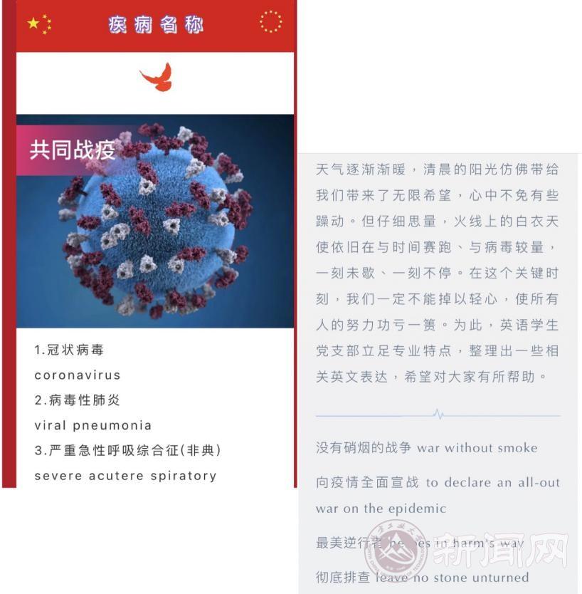 党支部坚持“停课不停学”、努力激发同学们热情学习。针对当今最大的时事热点——新冠肺炎疫情,支部成员阅读了大量英文资料,整理出相关的疾病、病理、防控、政策、机构的英文表达,丰富同学们的专业知识,使大家在疫情期间依然能够开阔视听。