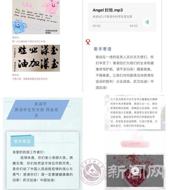 支部成员积极展示自身才艺,以唱歌、寄语、书法、绘画等方式表达对医护工作者的热切关怀与崇高敬意。良言一句三冬暖,大家用书法表达力量,用绘画传递大爱,用歌声唱响希望,将必胜的信念分享给更多的人。目前,已推出6期作品展示,得到了师生的积极转发。