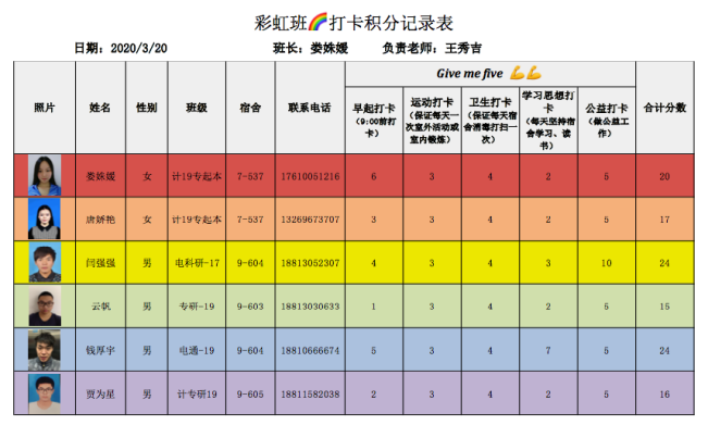 “彩虹班”学生打卡积分纪录表