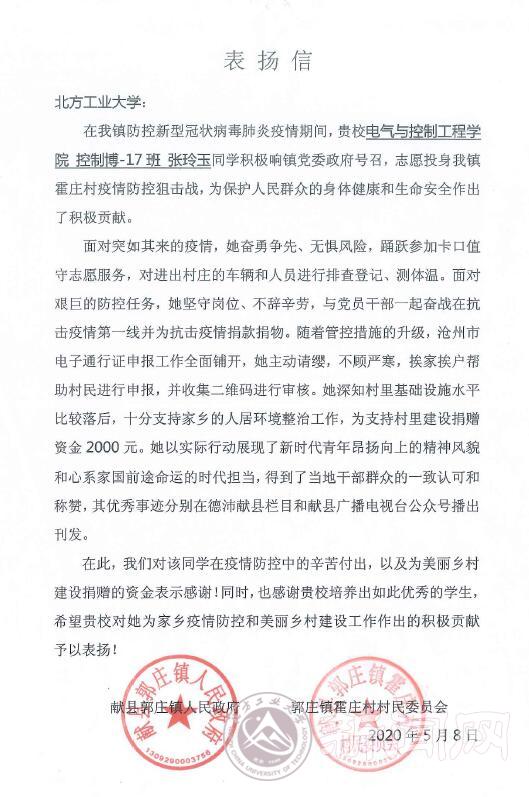 近日,电控学院党委收到一份邮政快递,是由河北献县郭庄镇人民政府和郭庄镇霍庄村村民委员会专门邮寄的表扬信,朴实无华的字里行间闪现的是Beat365学生党员临危不惧、冲锋在前、敢于担当的点点滴滴,是一个新时代大学生的风貌。