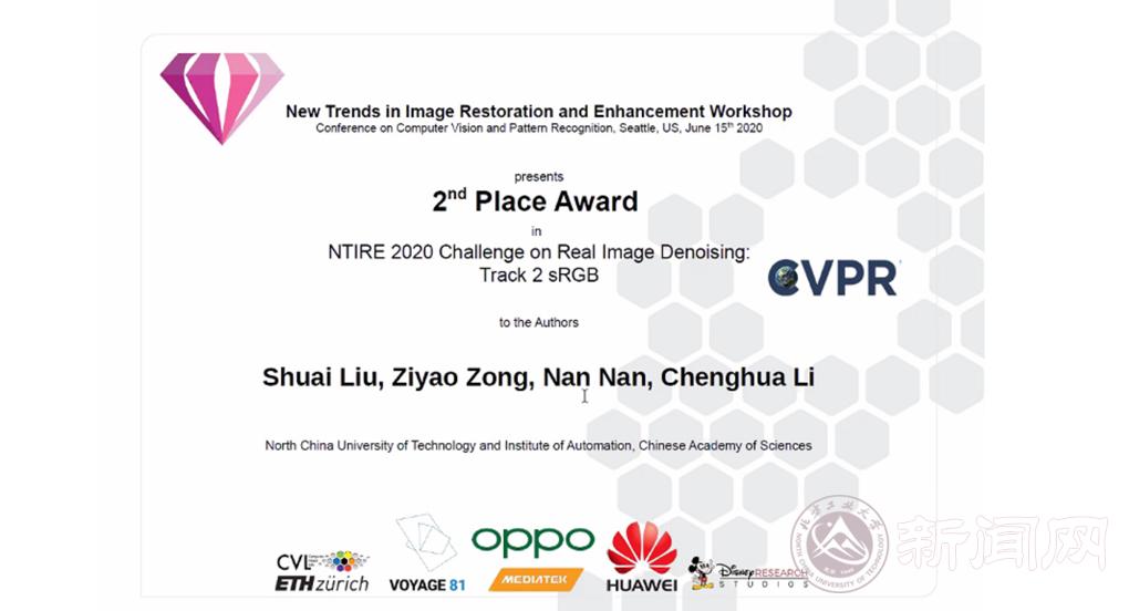 CVPR 2020 的Ntire Workshop中的 Demoireing Challenge(去摩尔纹挑战赛),分为两个赛道:单图像以及连拍图像,Real Image Denoising(真实图像去噪挑战赛)也分为两个赛道:rawRGB和sRGB。平均每个赛道均有100多支国际队伍参赛,只取前三名的队伍予以奖励。研究生刘帅、南楠在众多参赛团队中脱颖而出,获得第二名,他们的相关学术论文也被大会录用。