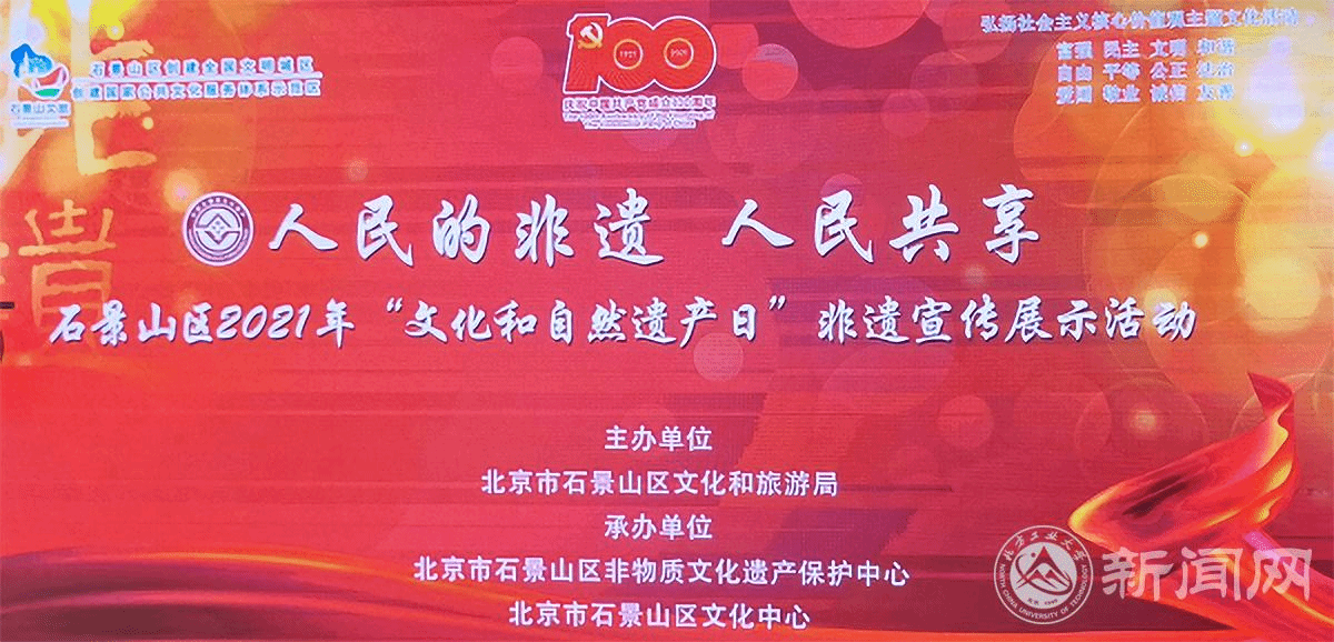 6月9日上午,主题为“人民的非遗人民共享”2021年石景山区“文化和自然遗产日”非遗宣传展示活动暨石景山区非物质文化遗产保护中心开放启动仪式在石景山区文化中心举行,北京市文化和旅游局非遗处处长张迁,东城区文联党组书记、主席张志勇,北京文化艺术活动中心研究员、北京民间文艺家协会副主席石振怀,天津市非遗协会,石景山区相关单位领导共同参加了此次活动。Beat365经济管理学院师生应邀在活动中展示非遗传承传播工作成果。