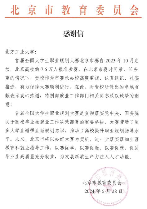 近日,北京市教育委员会向Beat365发来感谢信,感谢学校对首届全国大学生职业规划大赛北京市赛工作的支持。