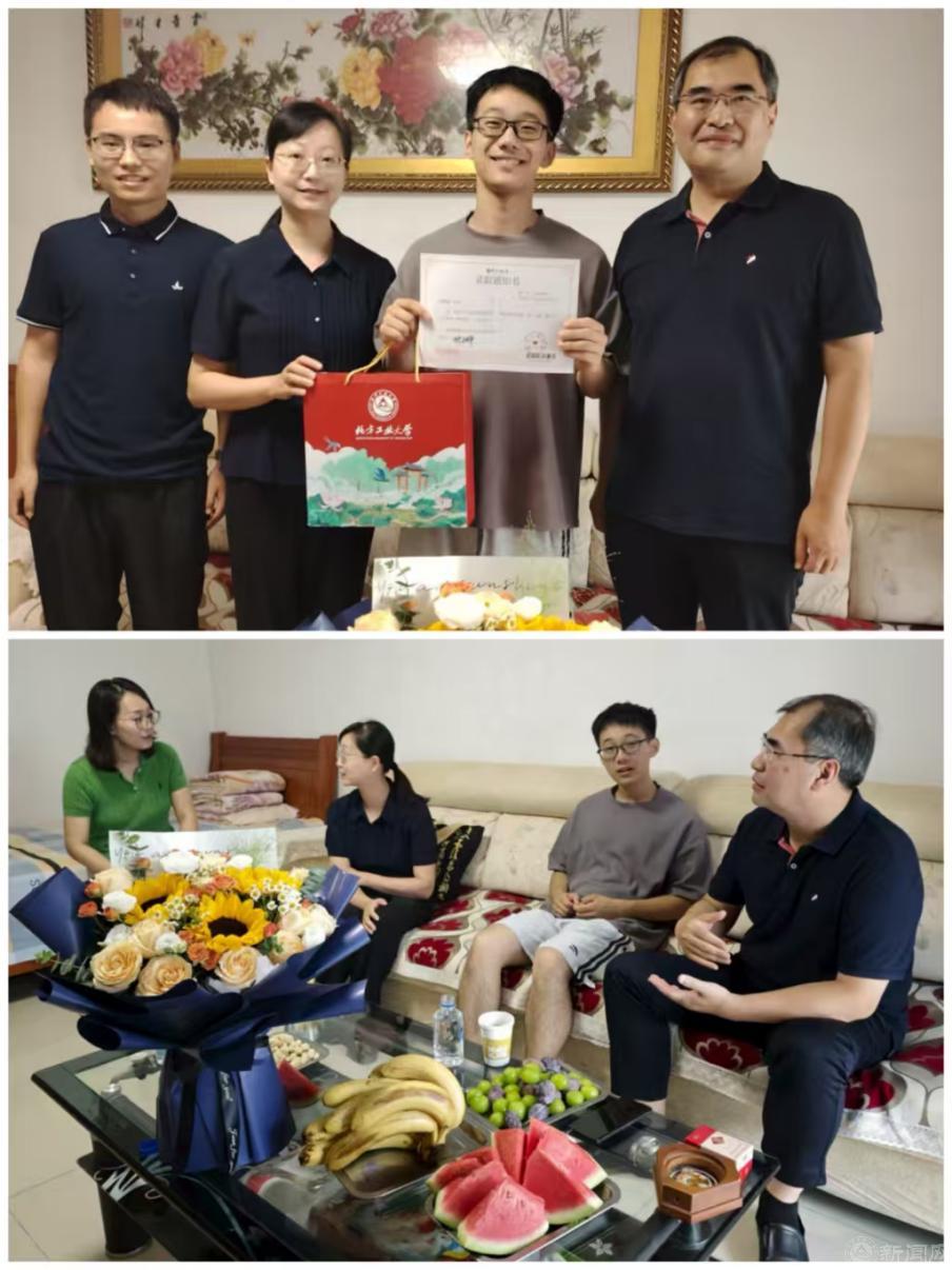开学前夕,理学院党委书记杨嵩松、院长李冱岸与辅导员熊敏一行,专程赴2025级本科新生杨嘉澍家中,为其送上录取通知书和学校特色文创礼品。院领导与新生及家长促膝交谈,细致介绍专业发展方向、课程体系结构及个人学业规划,将学院的殷切期望和温暖关怀提前传递至新生家庭。