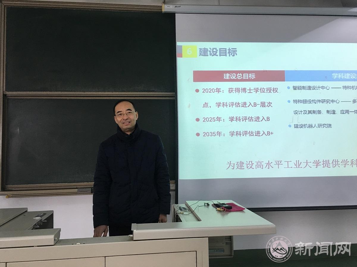 院长李强对照学校深化“内涵、特色、差异化”发展,建设高水平特色大学的目标,结合第四轮学科水平评估,对学院学科现状、学科优势、申报博士授权单位及博士授权点前景进行了深入分析,对全力做好机械工程博士学位授权点建设提出了目标、任务和措施。