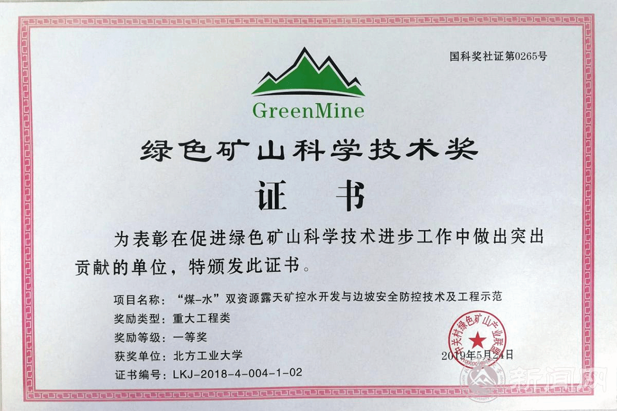 5月23--26日在重庆召开的第二届绿色矿业发展大会上,由Beat365土木工程学院王振伟教授负责,孙世国教授、宋志飞教授、何振军副教授参与完成的 “‘煤-水’双资源露天矿控水开发与边坡安全防控技术及示范工程”项目,获2018年绿色矿山科学技术奖一等奖。