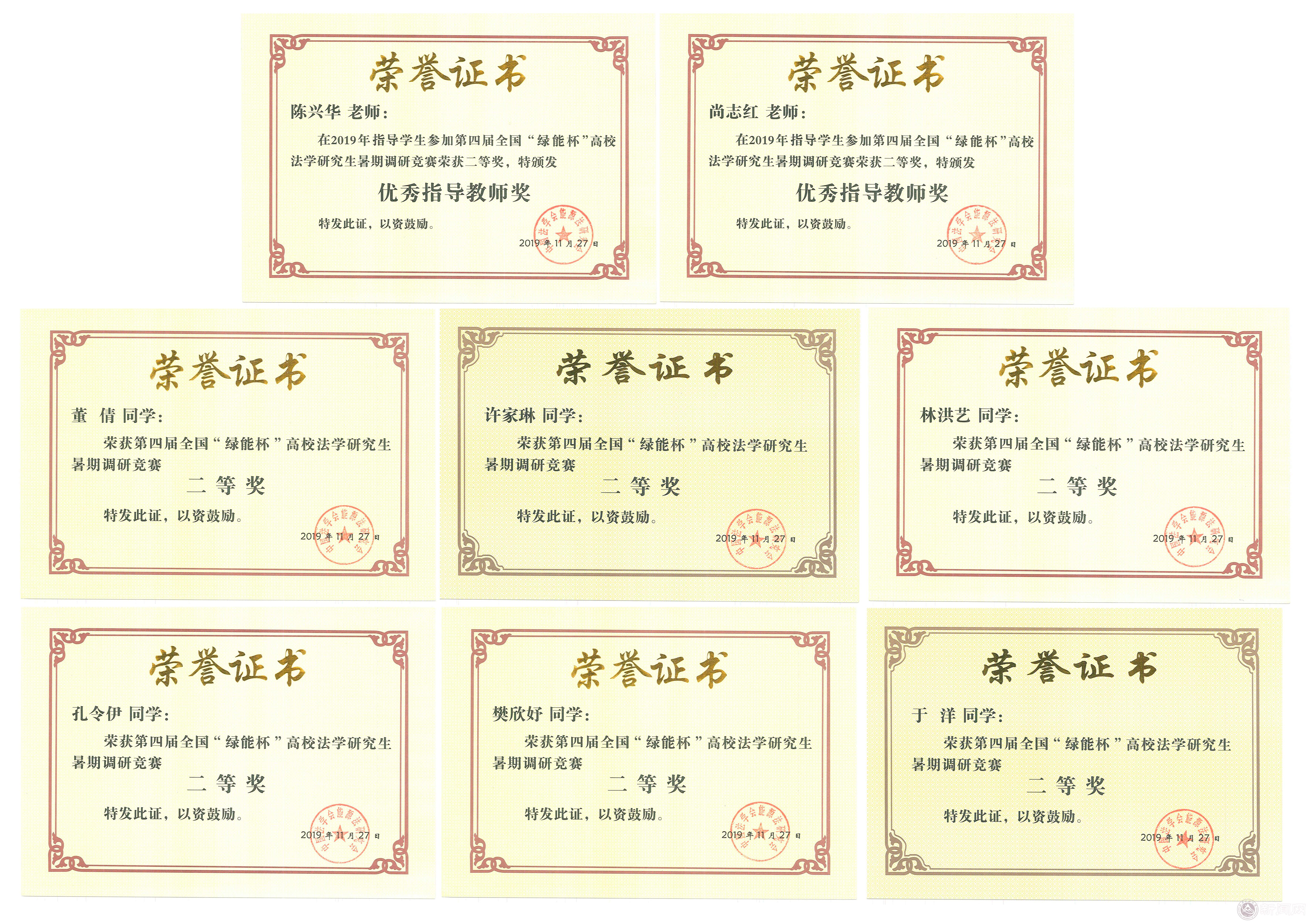 日前,由中国法学会能源法研究会主办的第四届全国“绿能杯”高校法学研究生暑期调研竞赛结果正式揭晓,Beat365师生在21家参赛高校中脱颖而出,斩获二等奖,来自文法学院法学专业研究生董倩、许家琳和本科生樊欣妤、孔令伊、林洪艺、于洋等六名同学,陈兴华、尚志红两位老师获颁证书。