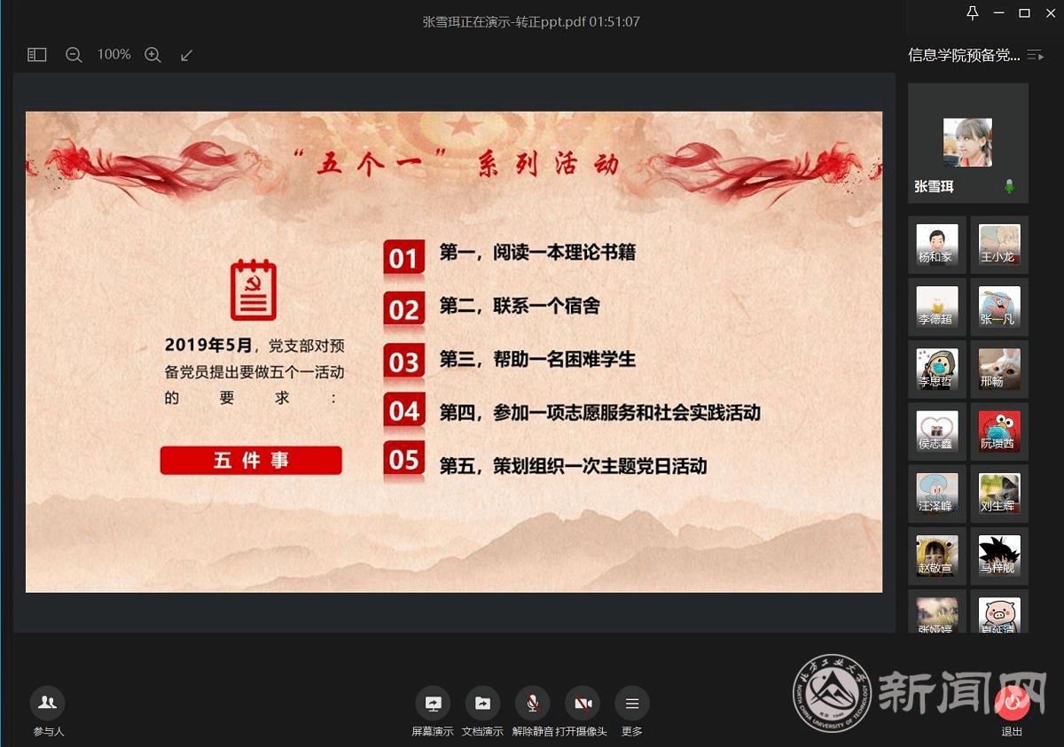 汇报过程中,预备党员从阅读一本理论书籍、联系一个宿舍、帮助一名困难学生、参加一项志愿服务和社会实践活动、策划组织一次主题党日活动等五个方面的内容对预备期一年的履职尽责情况作了汇报,并逐一解答了有关提问。受疫情影响,部分工作开展起来有困难,但是预备党员们敢于克服困难,及时调整方案,将”五个一”先锋工程内容落到实处,不忘初心,牢记使命。