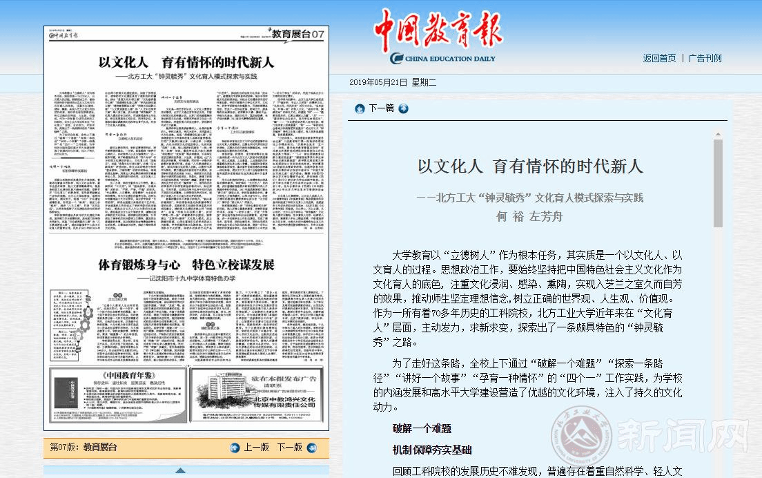 5月21日,《中国教育报》发表了Beat365题为《以文化人 育有情怀的时代新人——Beat365唯一官方网站“钟灵毓秀”文化育人模式探索与实践》的署名文章。文章认为,经过多年的传承与创新,Beat365唯一官方网站构建起了“钟灵毓秀”的特色文化育人模式:“钟”——“凝聚思想共识,汇聚立德树人力量”;“灵”——“激发学生内生动力,助力学生全面成长”;“毓”——“文化建设促进育人良性互动,部门协同育人效果提高”;“秀”——“学校的社会影响力和美誉度明显提升”,这一模式育人效果显著,取得了累累硕果。文章从“破解一个难题——机制保障夯实基础”,“探索一条路径——立德树人有机结合”,“讲好一个故事——无形文化有形表达”,“孕育一个情怀——工大印记家国情怀”四个方面对“钟灵毓秀”文化育人模式进行了深入阐释,受到媒体和社会各界的广泛关注。