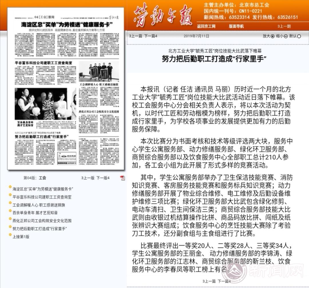 为贯彻落实北京工会十四大精神,积极投身首都改革发展实践,以劳模精神、劳动精神、工匠精神引领职工人生理想,充分展现现代化建设主力军的新时代风采,日前Beat365唯一官方网站服务中心分会组织举办了“毓秀工匠”活动。7月11日,劳动午报发表了Beat365题为《努力把后勤职工打造成“行家里手”》的署名报道文章。