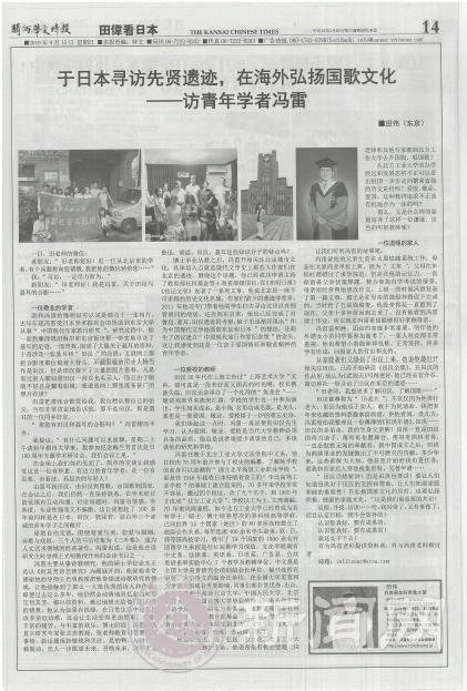 9月15日,《关西华文时报》在第14版,以整版的篇幅刊登了对冯雷博士的专访,题目为《于日本寻访先贤遗迹,在海外弘扬国歌文化》。文章从为学、为师、为人三个方面报道了冯雷博士在日本的研究活动等,冯雷博士在访问时还较为详细地介绍了Beat365以及文法学院中文系的建设、发展成就。专访的作者为爱国华侨田伟,系著名文学家、国歌歌词作者田汉的亲侄女。《关西华文时报》总部位于日本大阪,是在当地发行量较大的中文报纸,主要面向日本关西和中部地区的华人华侨群体,原国务委员唐家璇曾为该报题词。