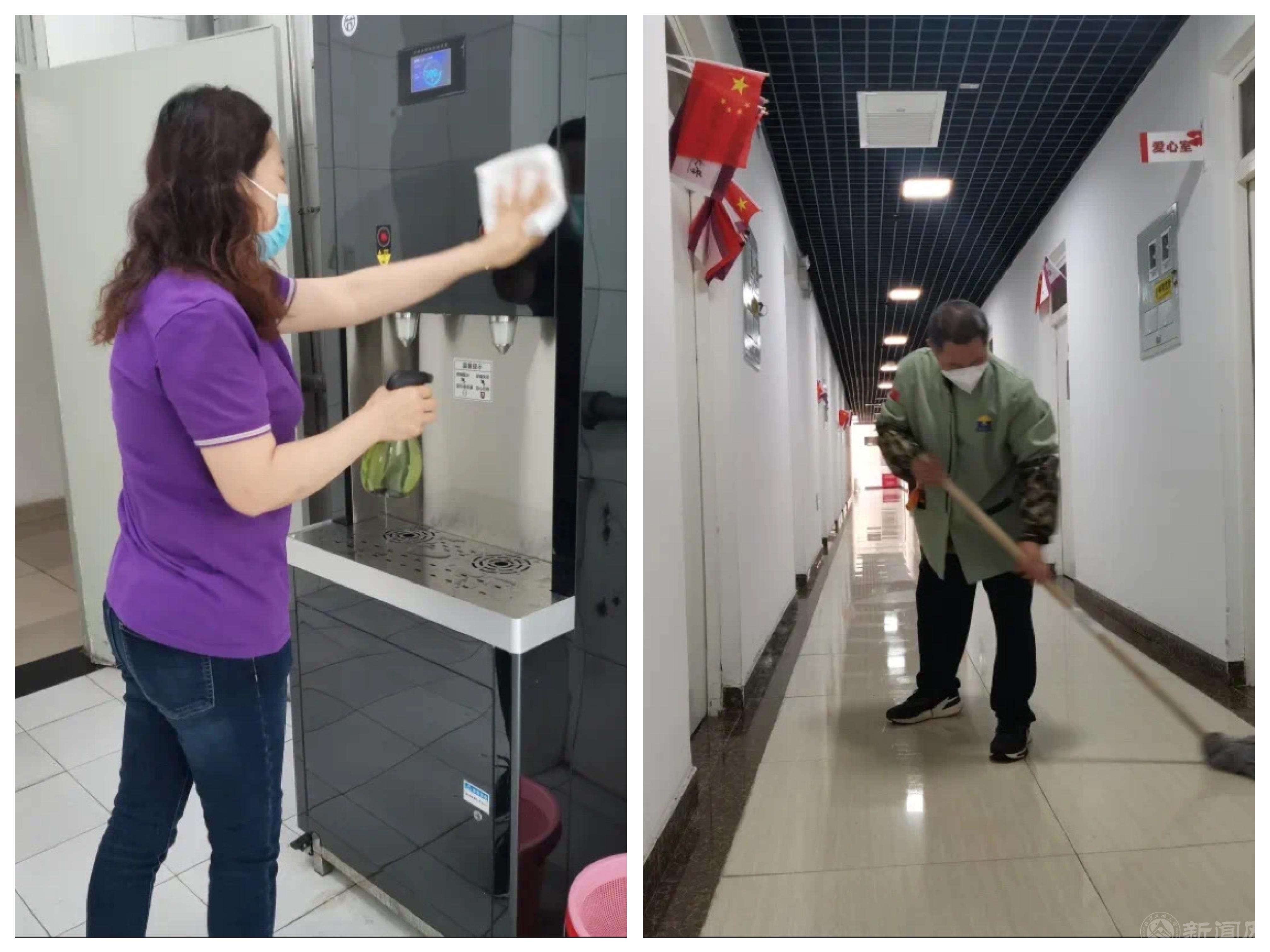 绿化环卫员工第一时间进入“战疫”状态,教学区内部分工作人员一人多岗,在做好楼宇值班工作的同时,还担负起卫生清扫和绿化养护等任务。室内外保洁人员全力做好教学区域的日常清洁、消杀以及垃圾清运工作,确保封闭后的校园环境依然洁净、美丽、安全。