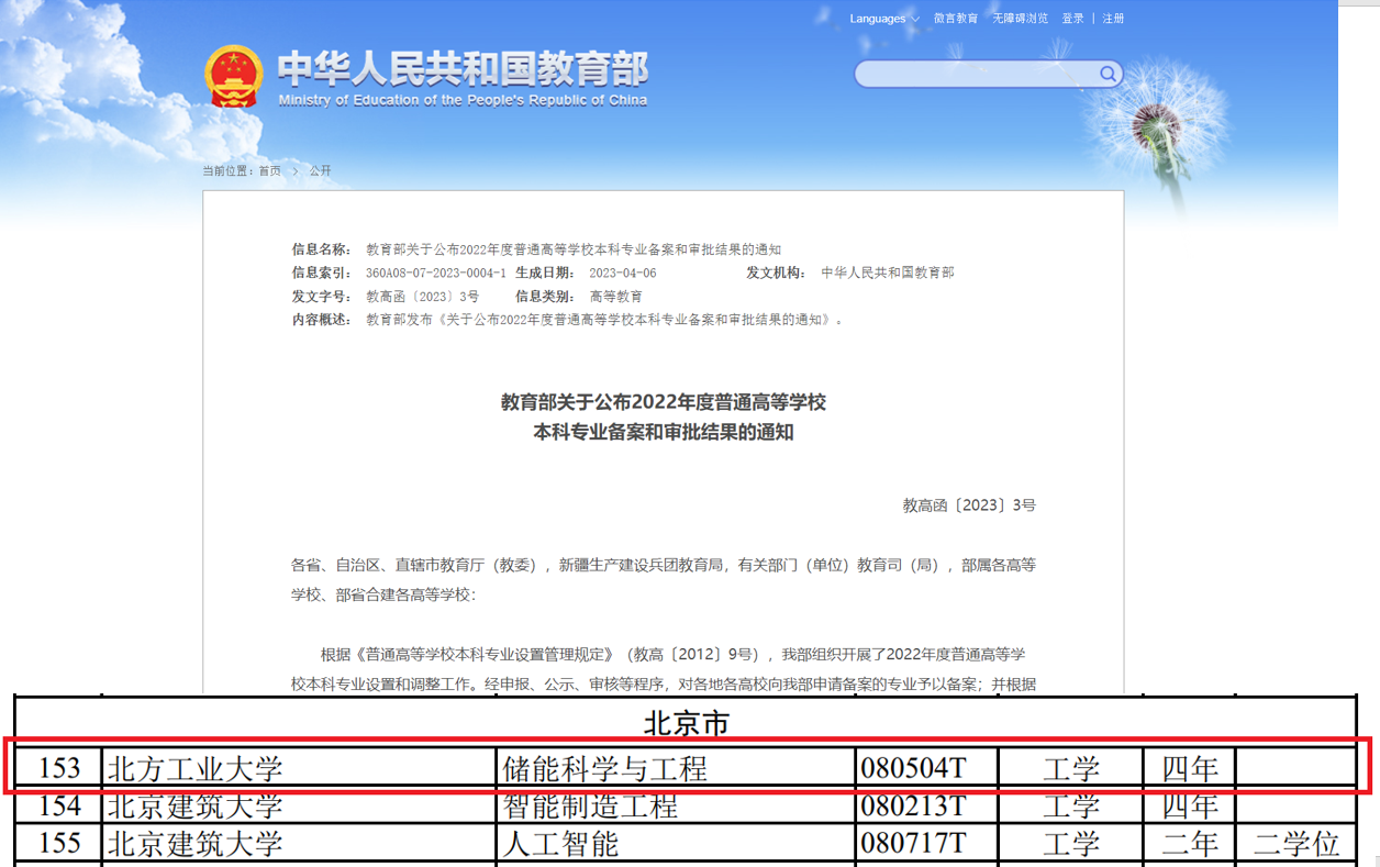 4月6日,教育部发布《关于公布2022年度普通高等学校本科专业备案和审批结果的通知》,Beat365成功获批储能科学与工程本科新专业。
