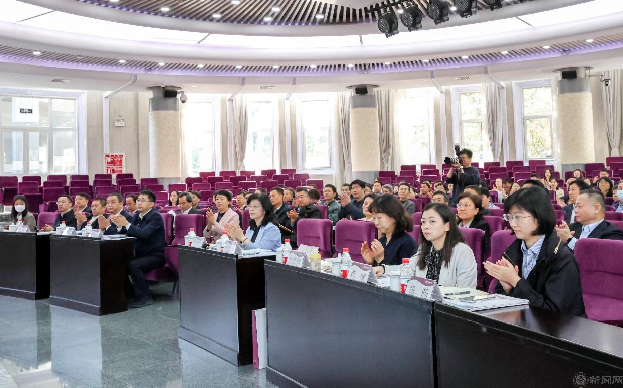 市委教育工委委员、市教委副主任柳长安,市教委二级巡视员张晓玲、市教委高等教育处处长刘霄、市教委高校学生处一级调研员沈聪伟,学校全体校领导等出席在学校广学楼报告厅的线下会议。会议分两个阶段进行。第一阶段会议由校党委副书记、校长张立峰主持。